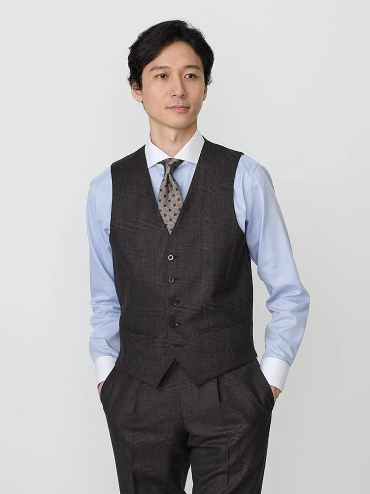 クラシカルで上品な華やかさがあるチェック柄のスリーピーススーツ。