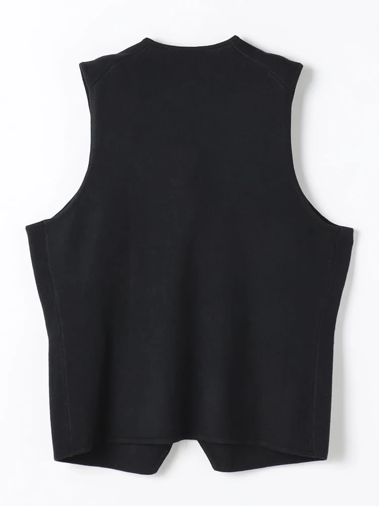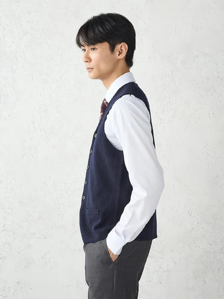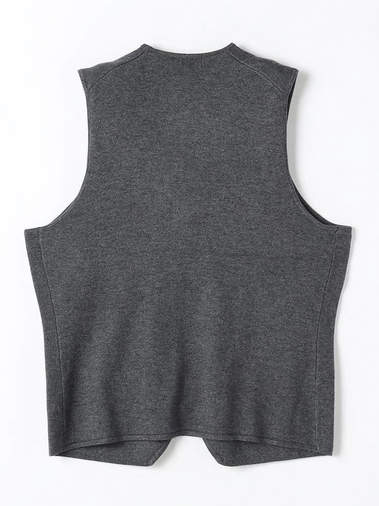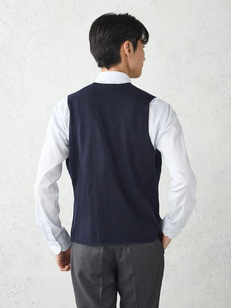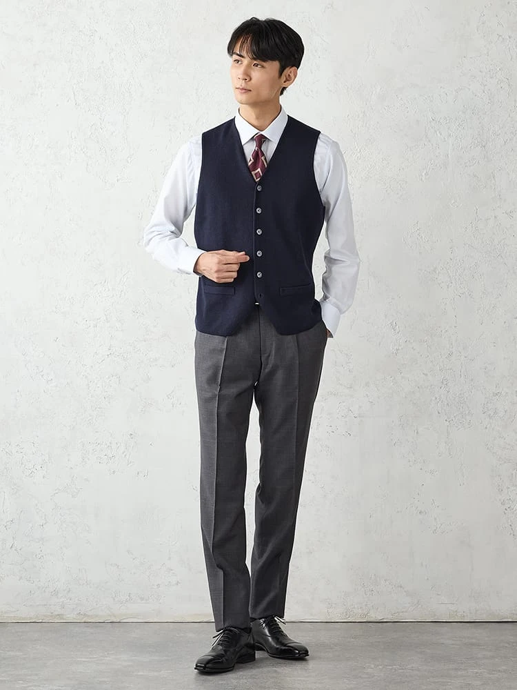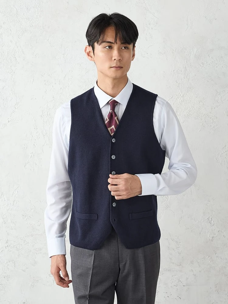 フロントを布帛で切り替えて、スーツのインナーとしても取り入れやすい端正なルックに仕上げたニットベスト。
