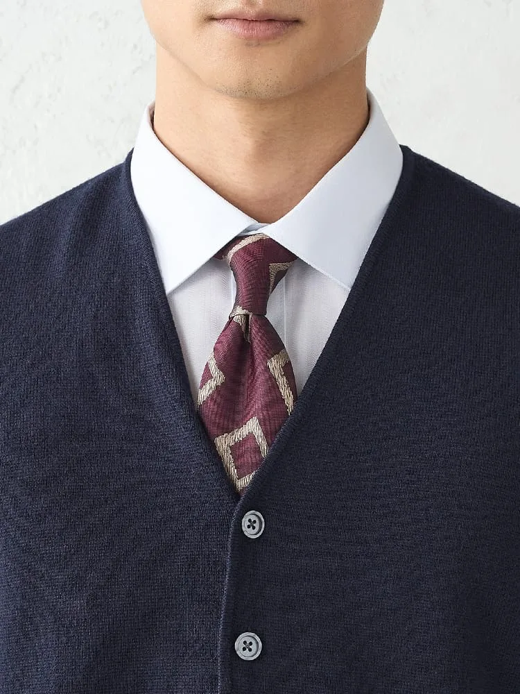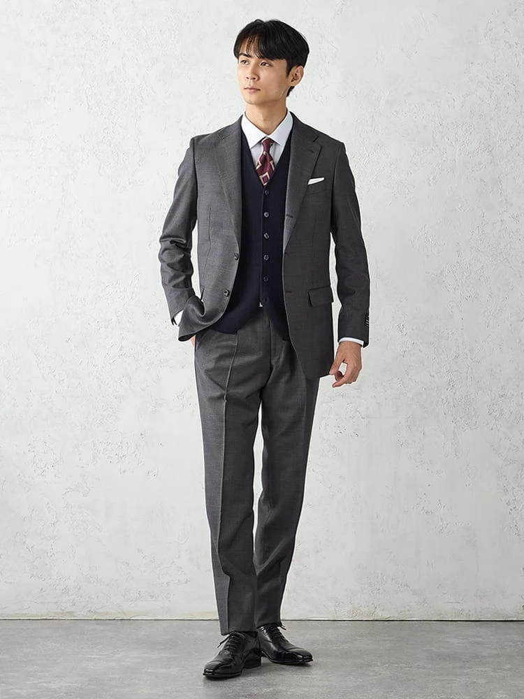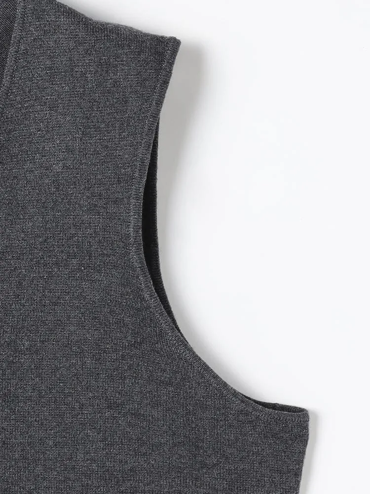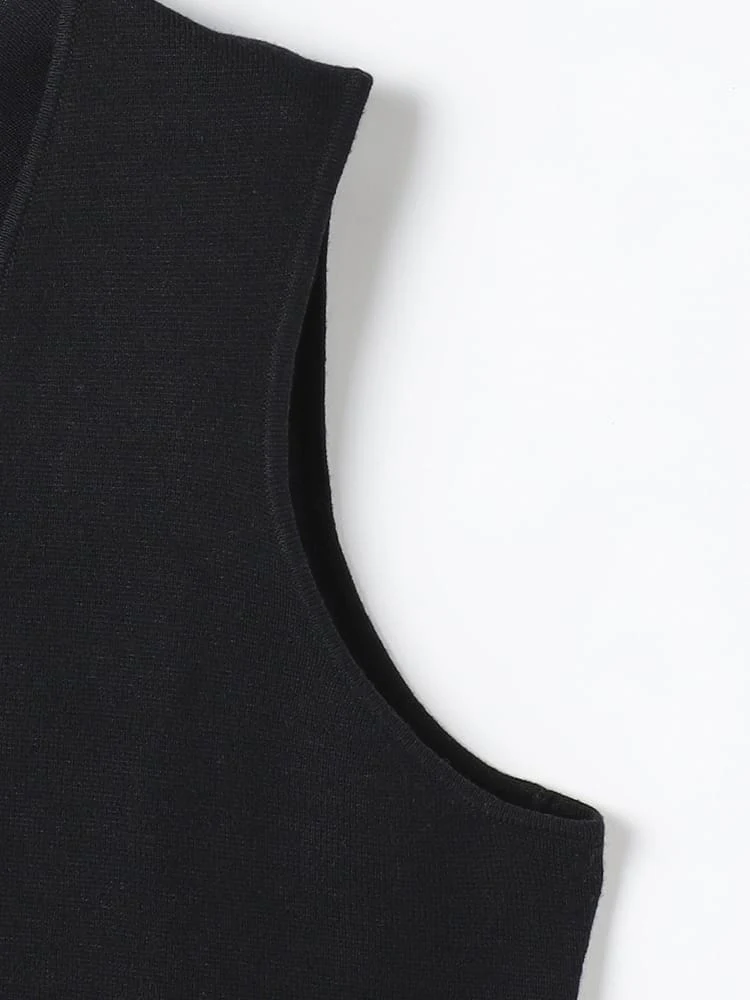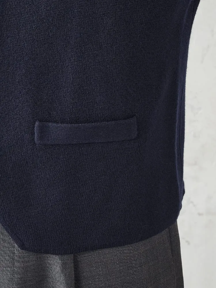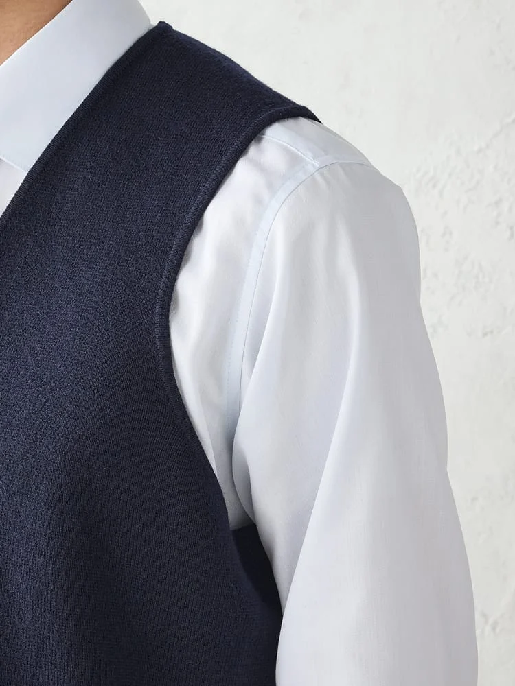 フロントを布帛で切り替えて、スーツのインナーとしても取り入れやすい端正なルックに仕上げたニットベスト。