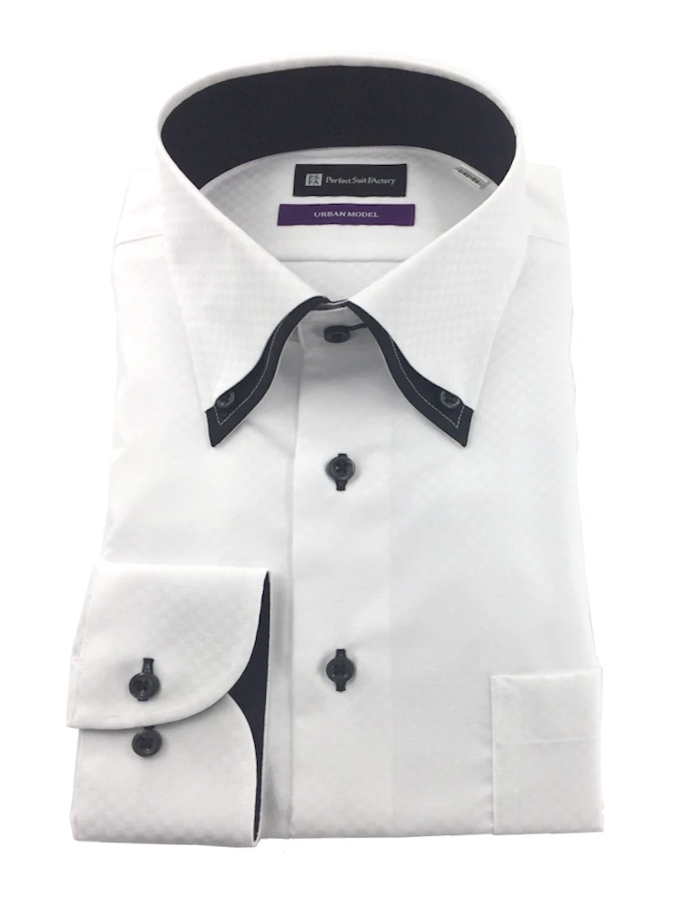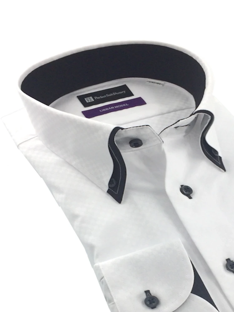 白ドビー織のテーパードフェイク2枚衿デザイン。
