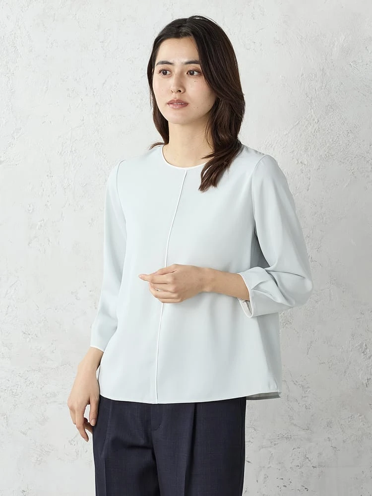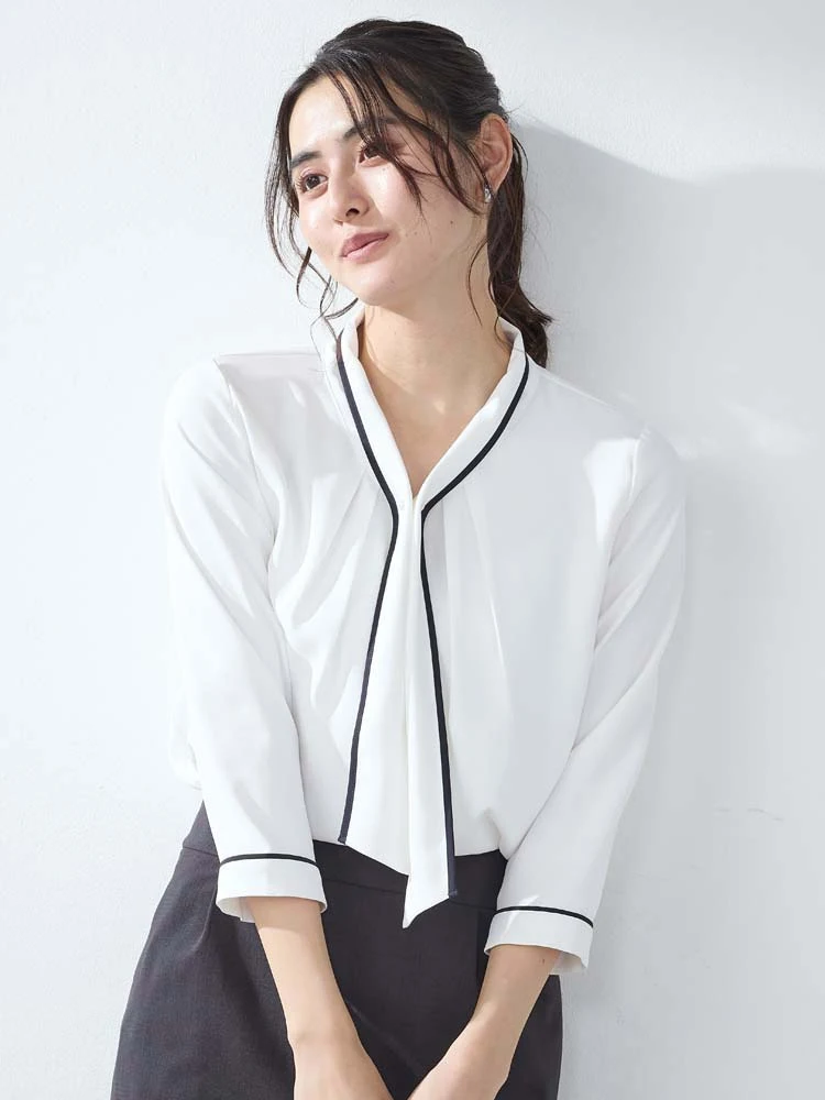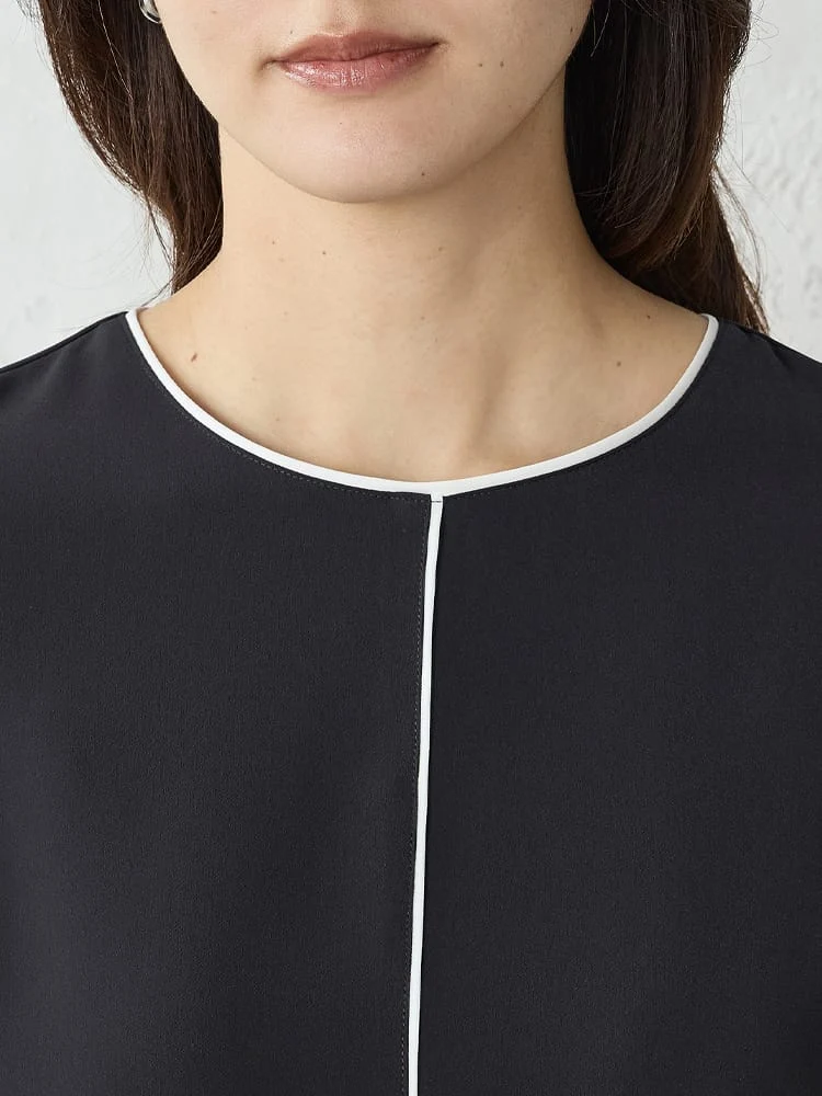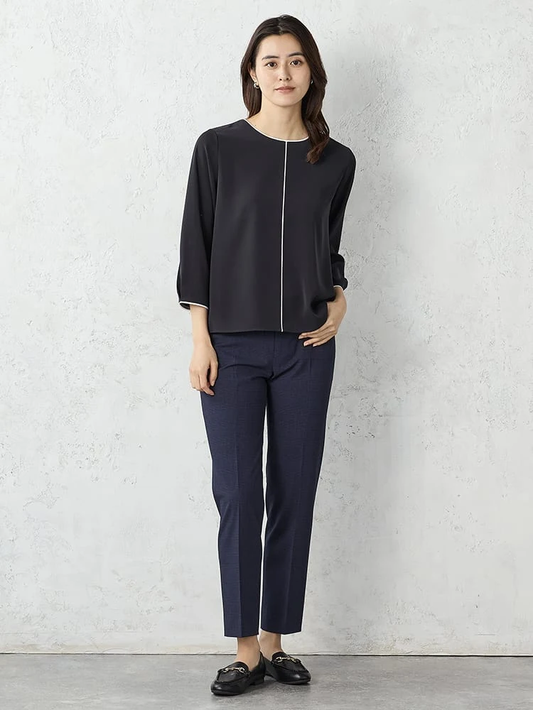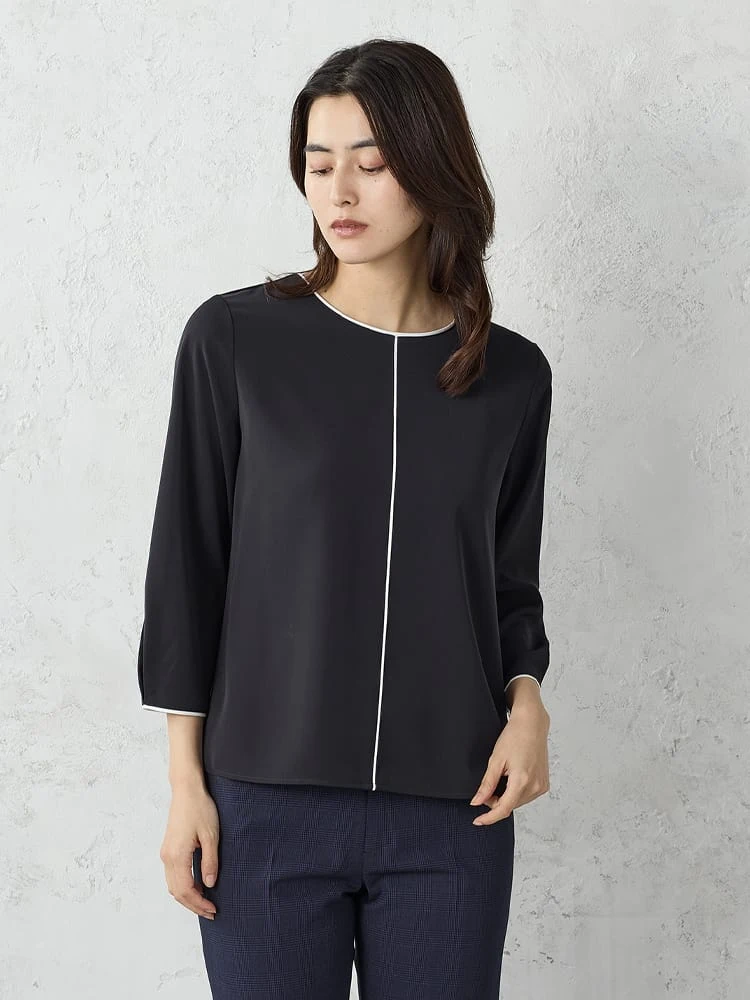 ネック回りと袖口、センターに配色パイピングを施したブラウス。