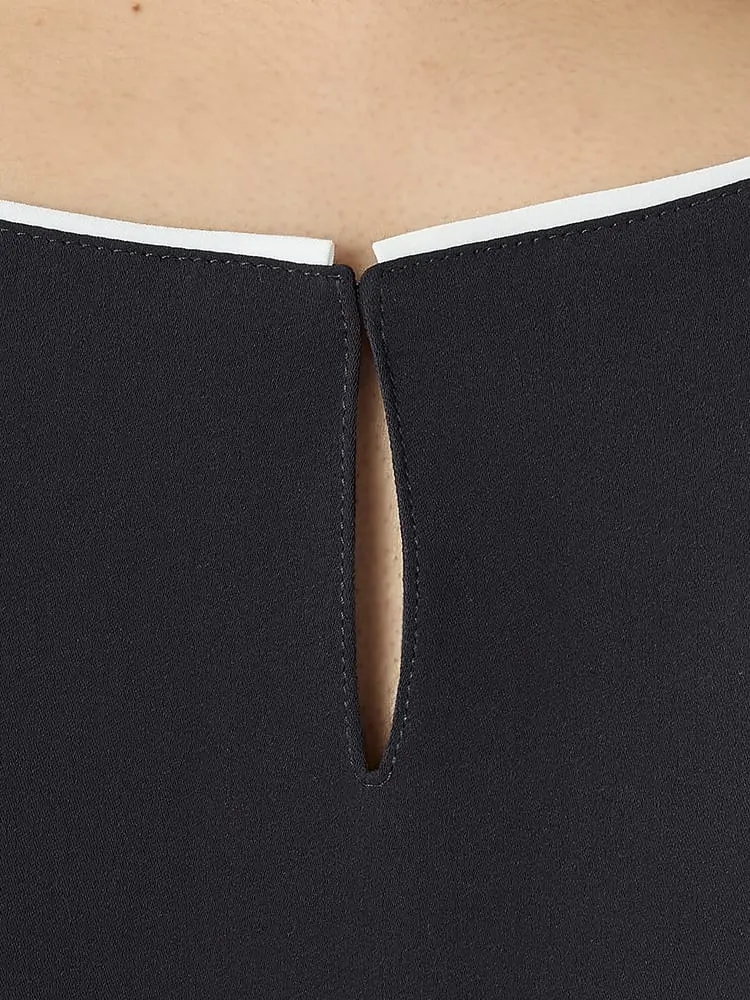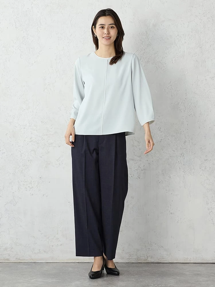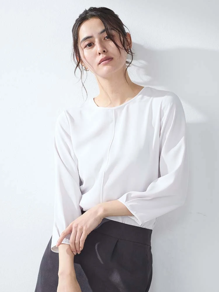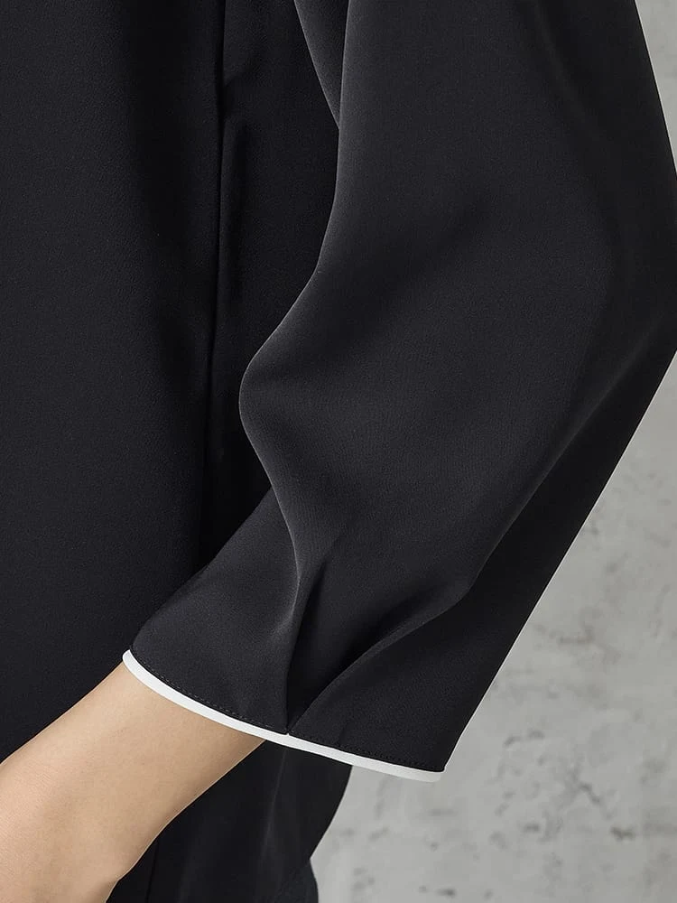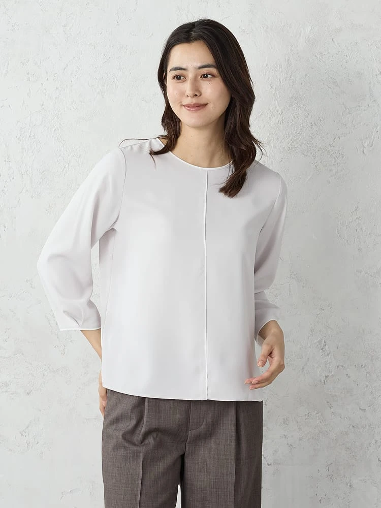 ネック回りと袖口、センターに配色パイピングを施したブラウス。