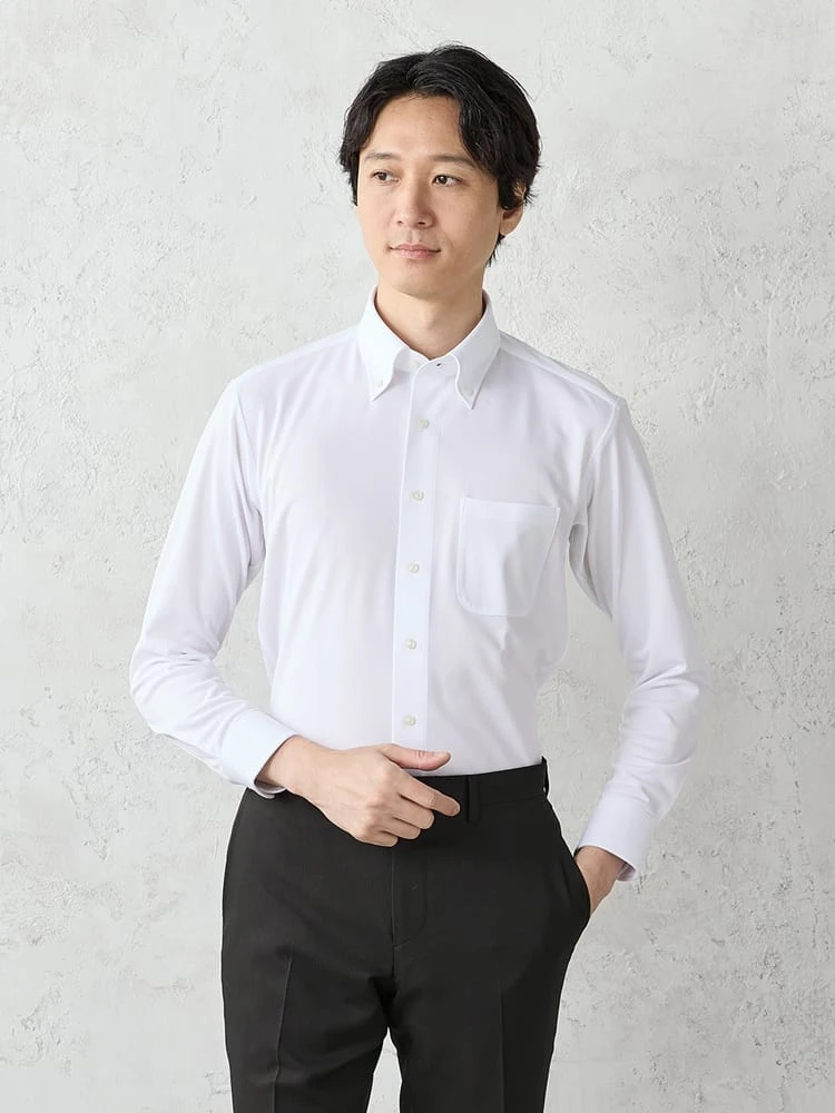 【完全ノーアイロン】長袖アイシャツ織柄ボタンダウンホワイト<2点で1,000円OFF/3点で2,000円OFF!>