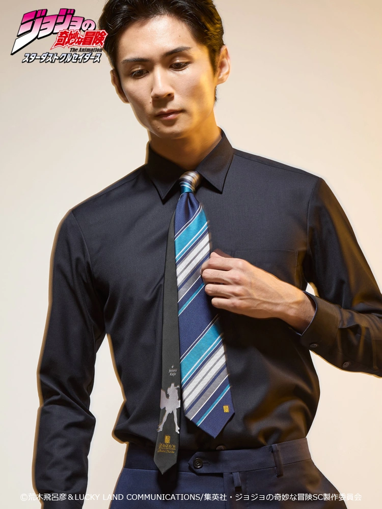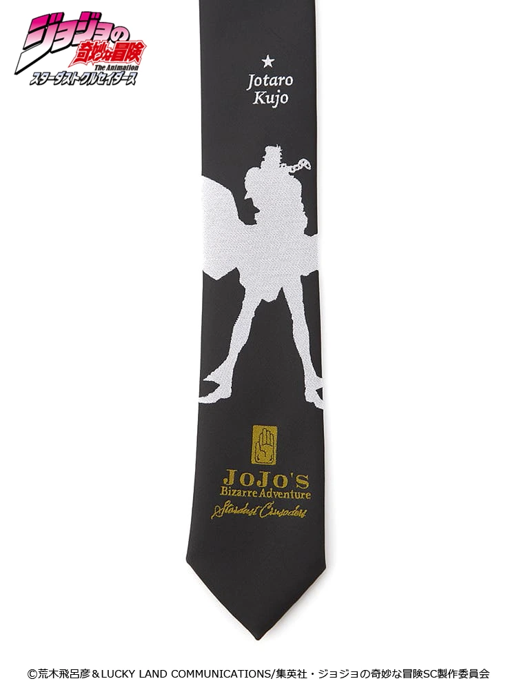 アニメ『ジョジョの奇妙な冒険 スターダストクルセイダース』の世界観を表現したネクタイ。小剣には空条承太郎のシルエットを表現し、大剣には空条承太郎モチーフをエンブレム調に表現しました。