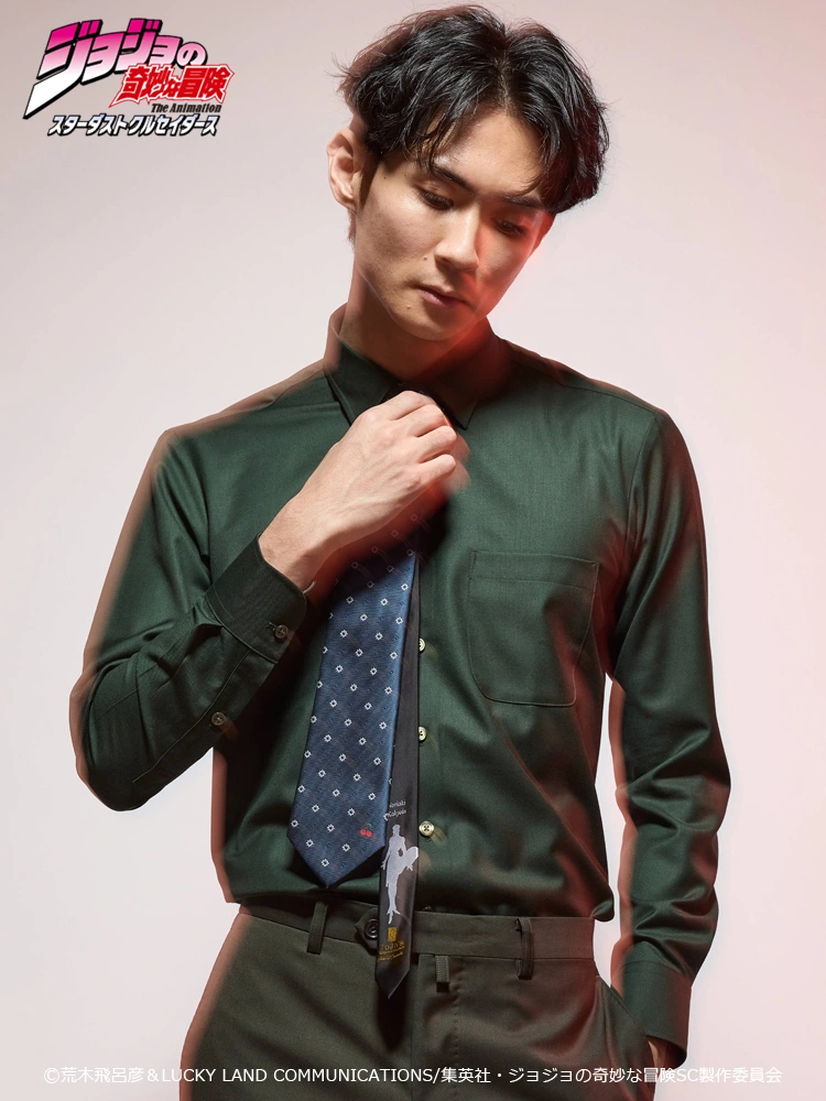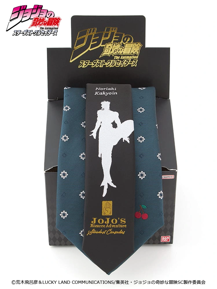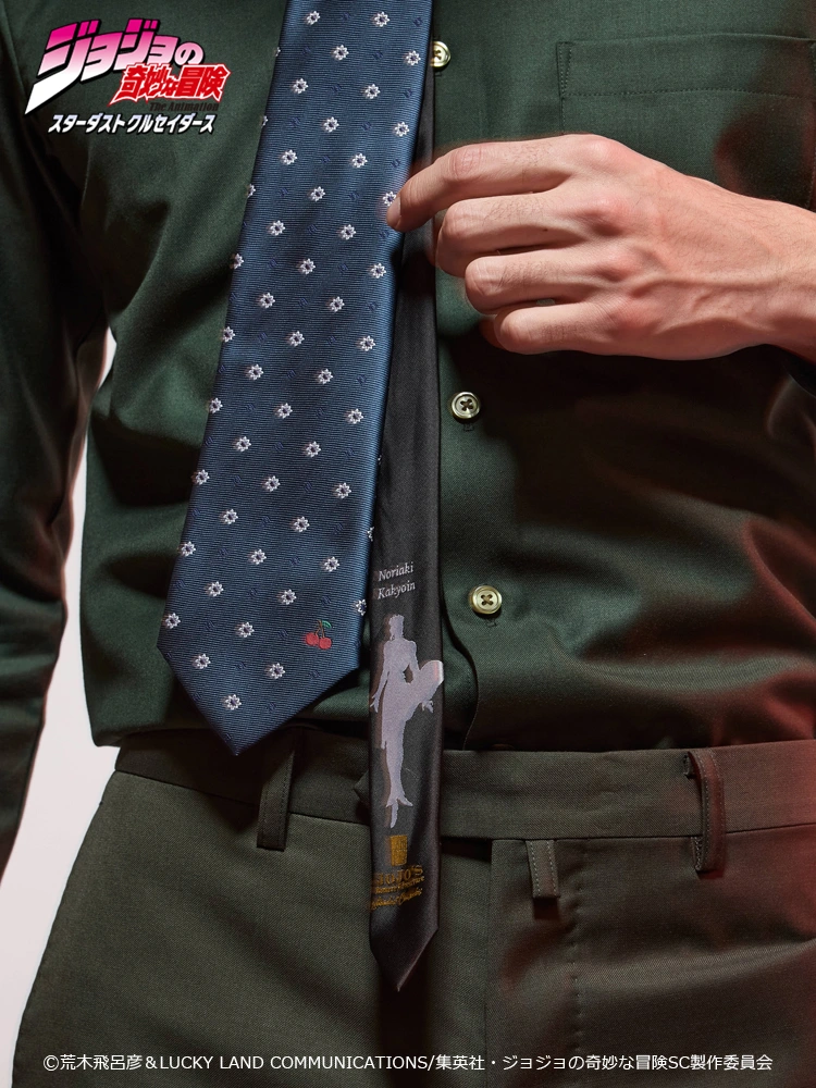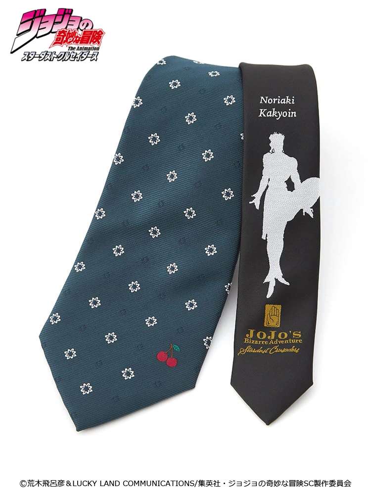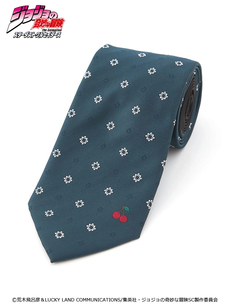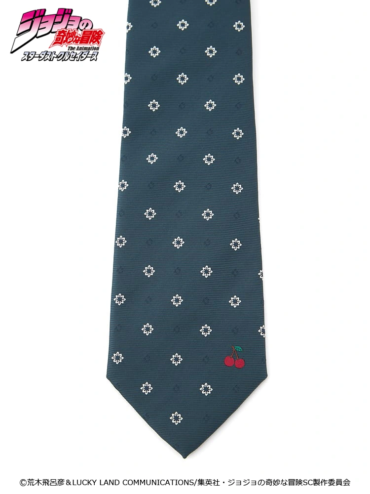 アニメ『ジョジョの奇妙な冒険 スターダストクルセイダース』の世界観を表現したネクタイ。小剣には花京院典明のシルエットを表現し、大剣にはチェリーをあしらいました。