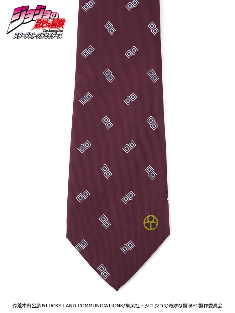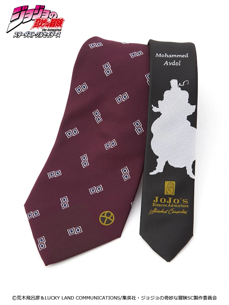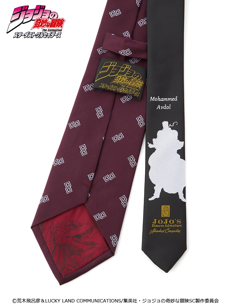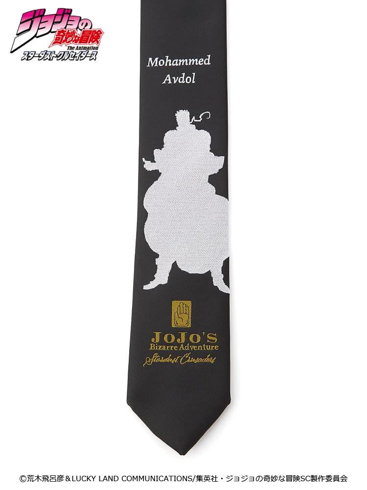 アニメ『ジョジョの奇妙な冒険 スターダストクルセイダース』の世界観を表現したネクタイ。小剣にはモハメド・アヴドゥルのシルエットを表現し、大剣には身に着けているアクセサリーのモチーフをあしらいました。