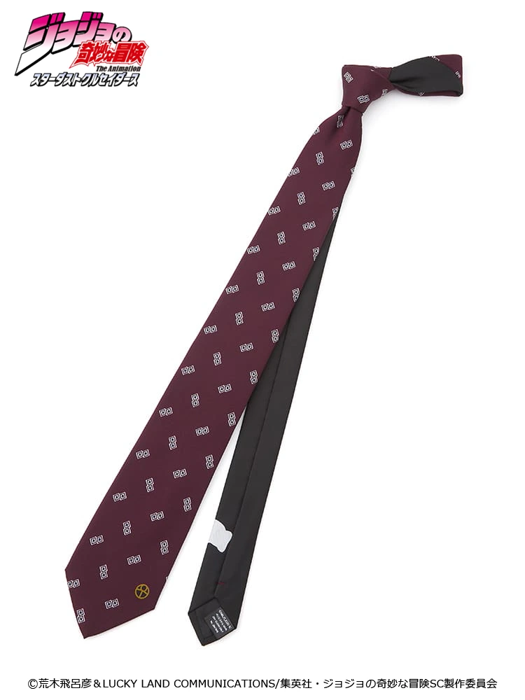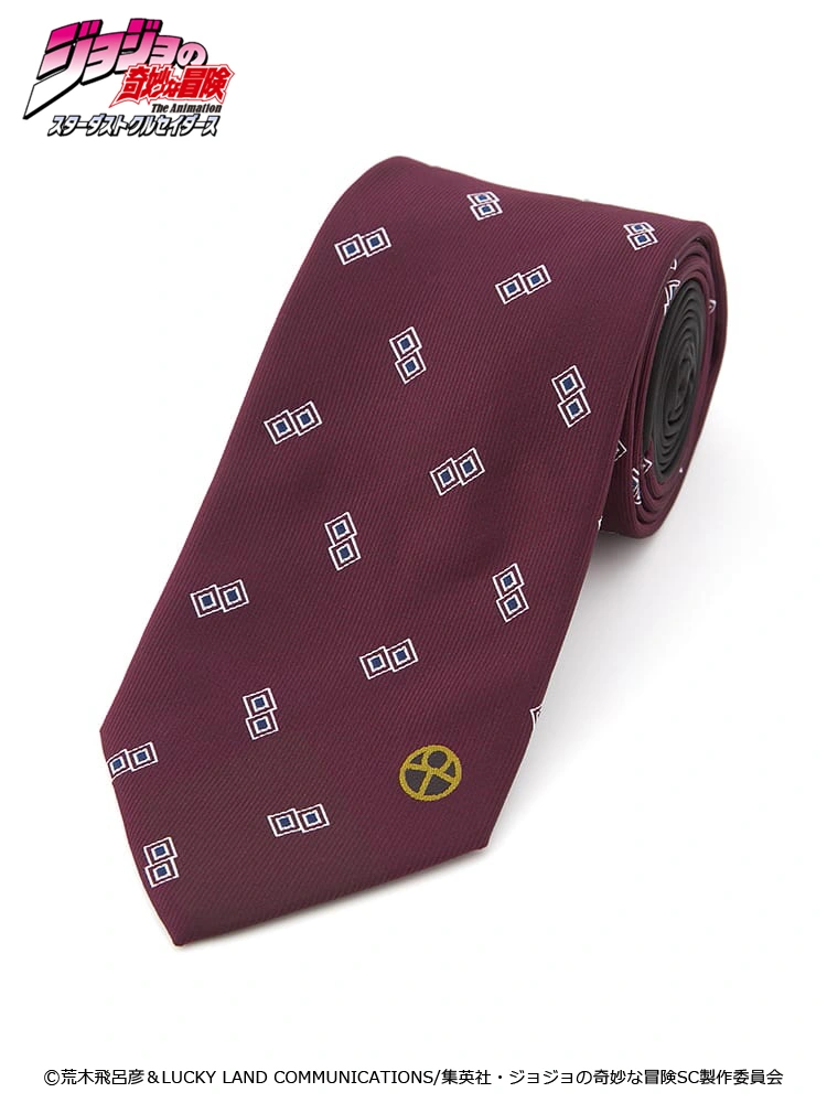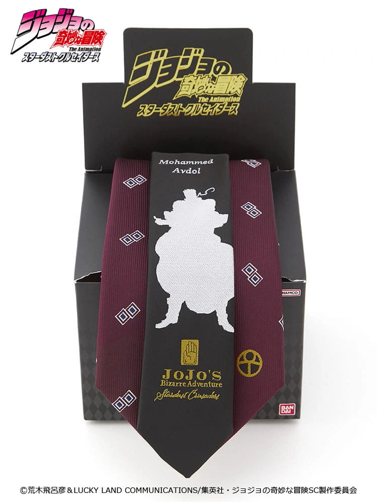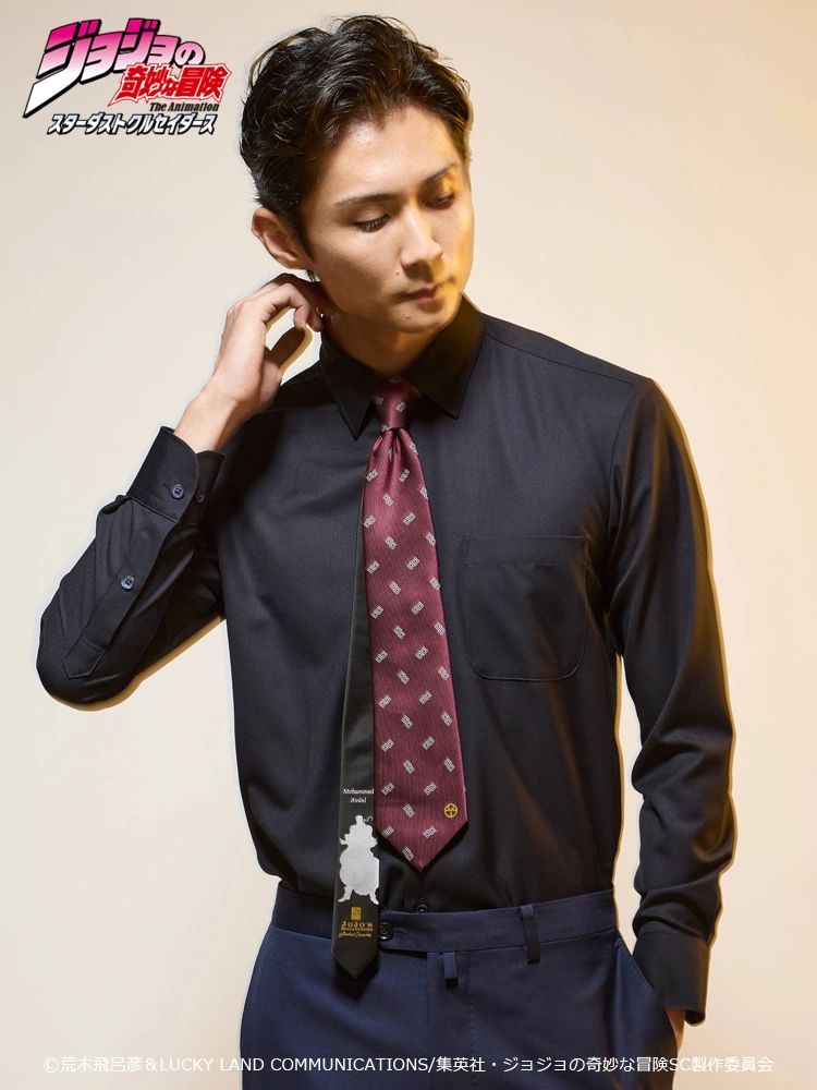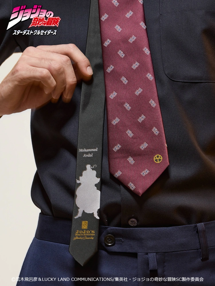 アニメ『ジョジョの奇妙な冒険 スターダストクルセイダース』の世界観を表現したネクタイ。小剣にはモハメド・アヴドゥルのシルエットを表現し、大剣には身に着けているアクセサリーのモチーフをあしらいました。