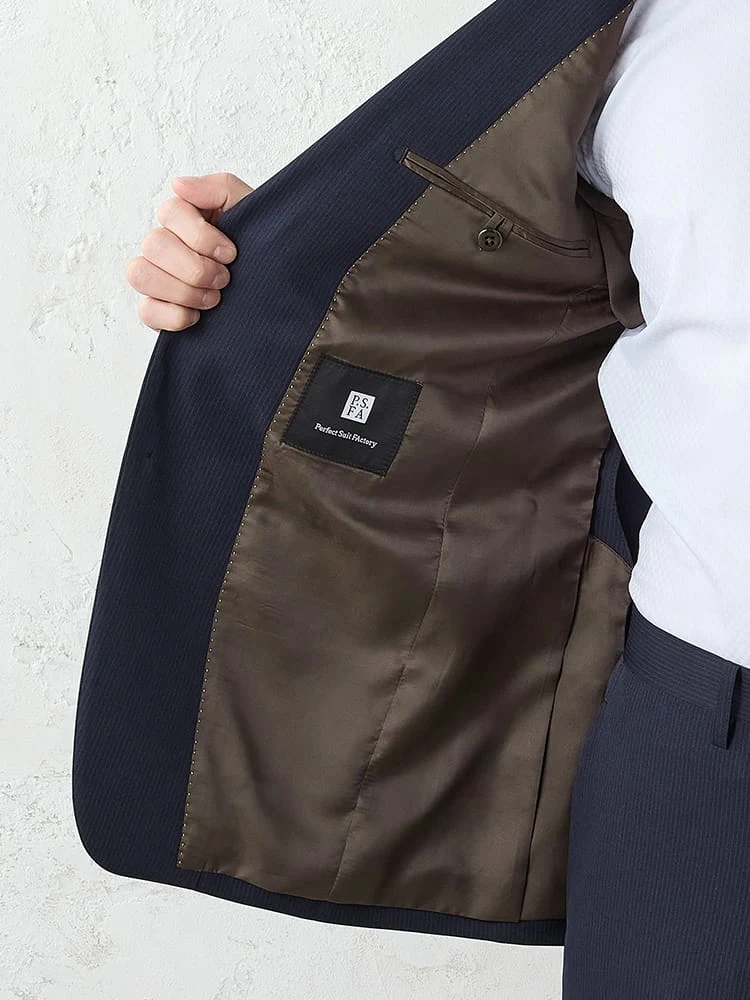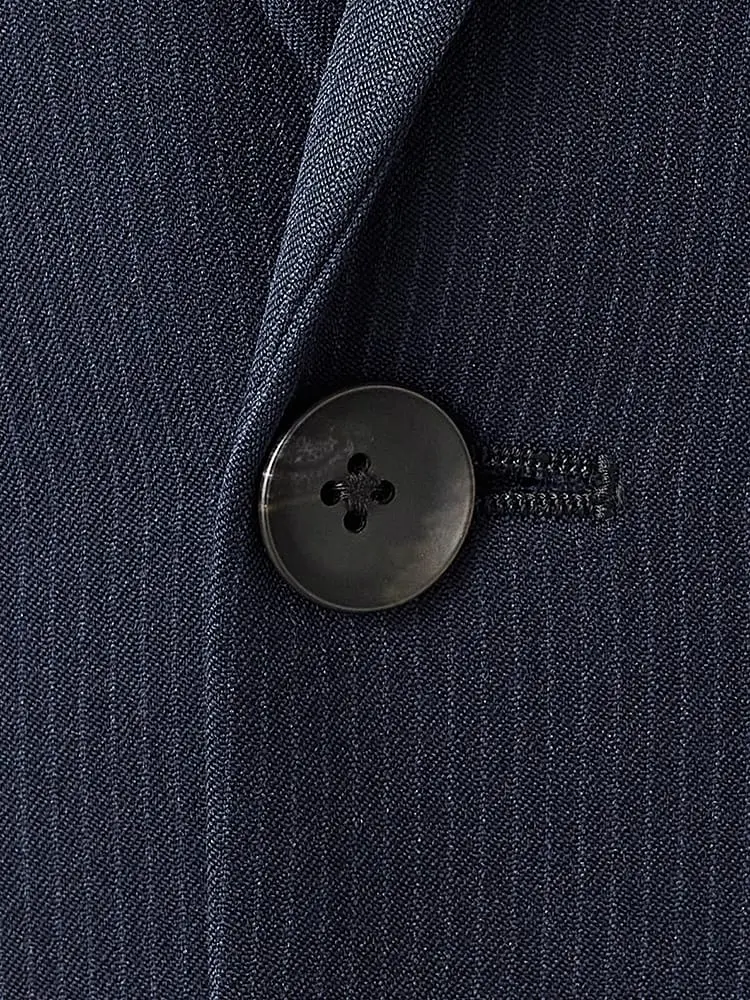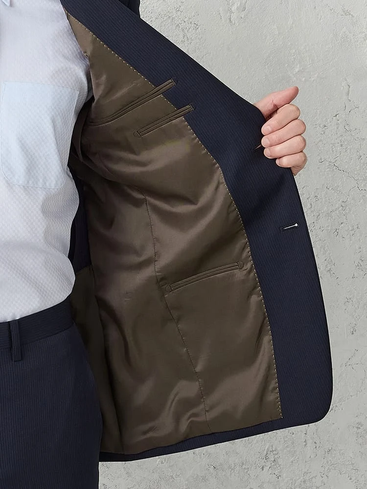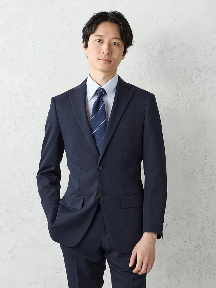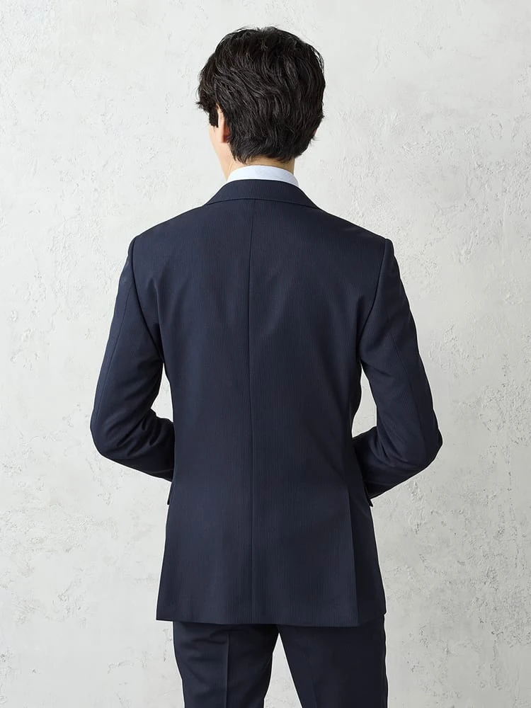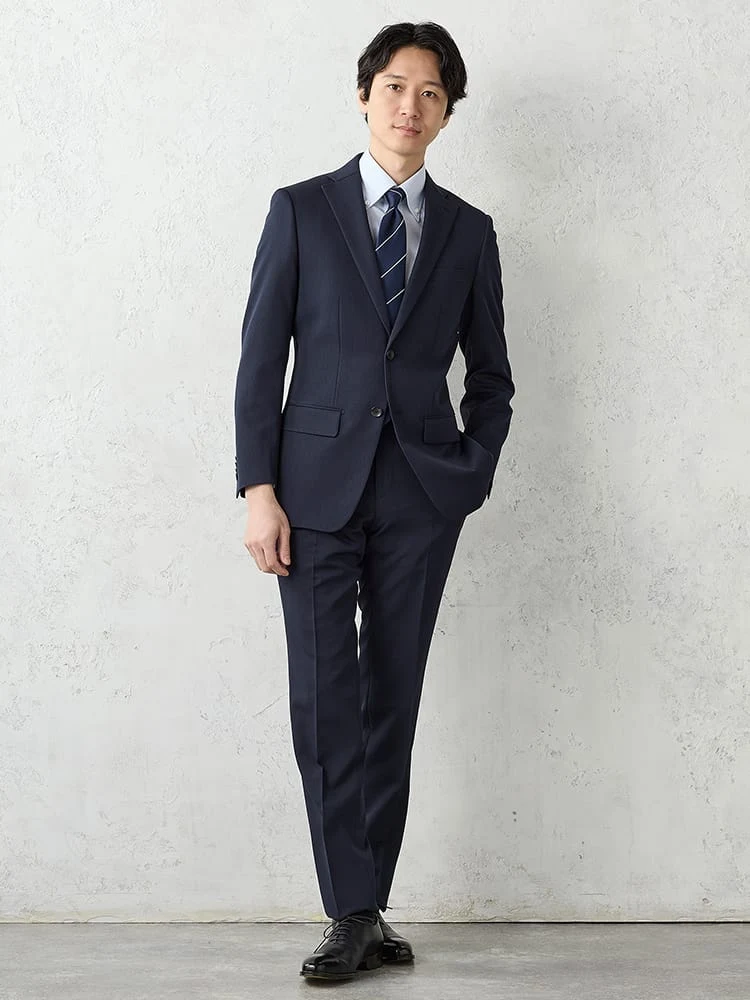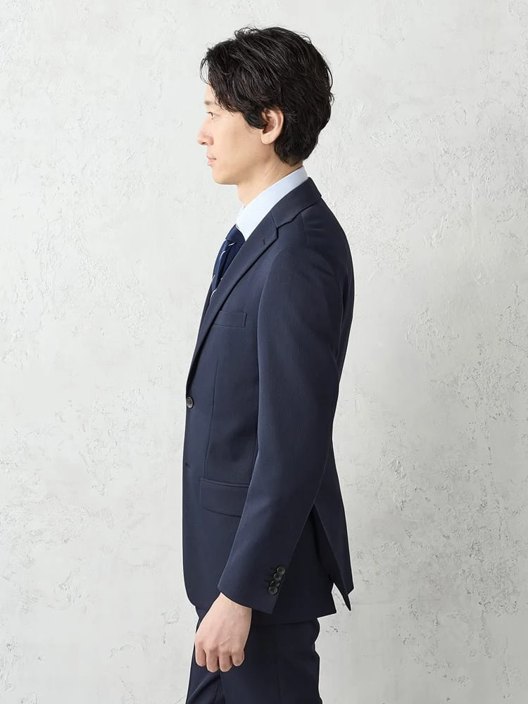 ジャケットは背抜きの裏地で動きやすく、スラックスはすっきりとしたノータックでビジネスシーンにぴったり。
