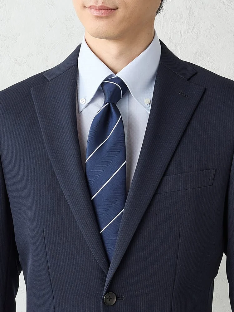 【濃紺の落ち着いたスーツと、ブルー系のワイシャツ、ネクタイの3点セット!】