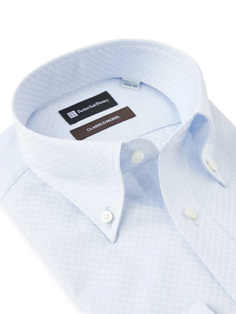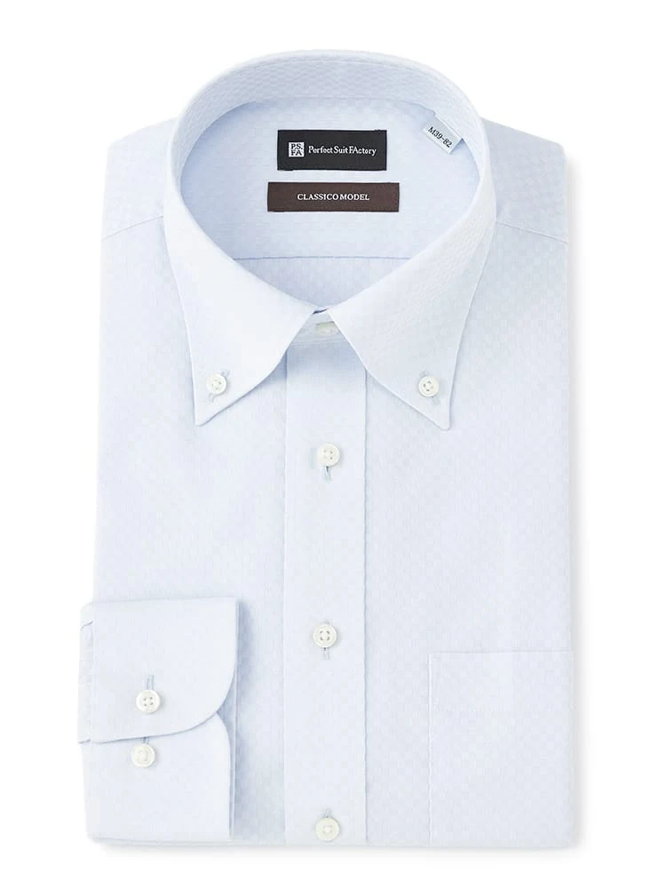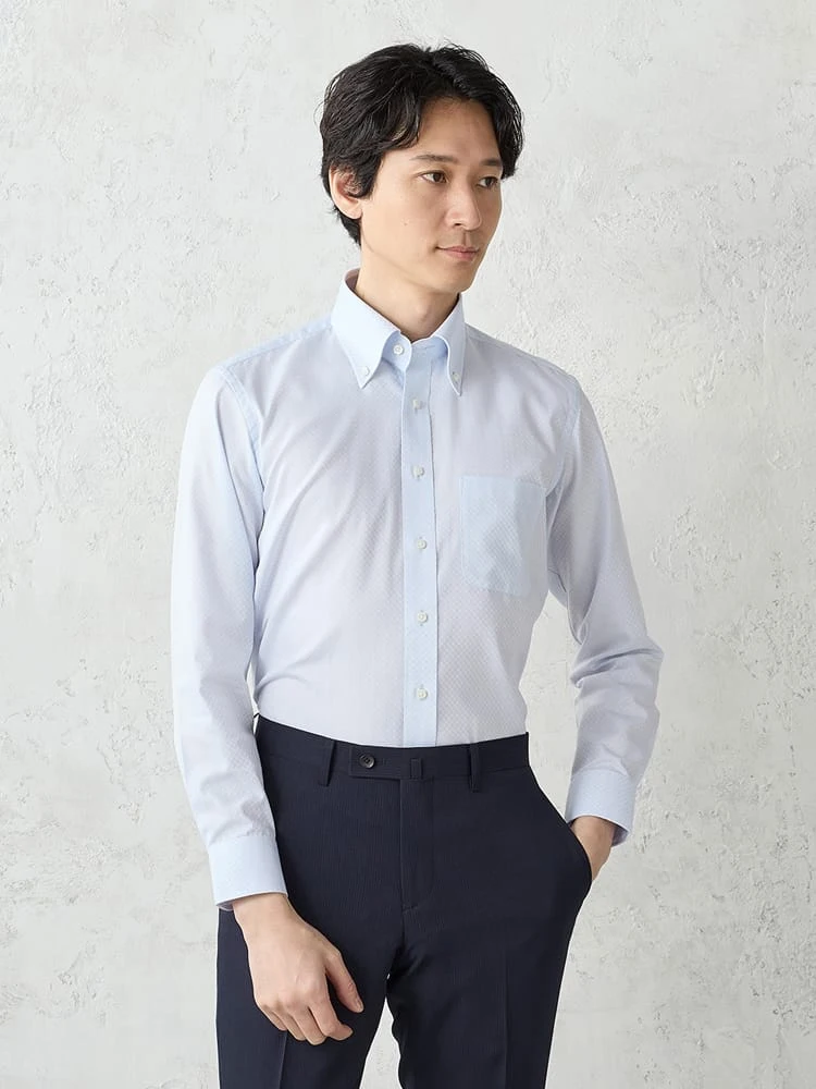 明るいサックスブルーで、爽やかなボタンダウンシャツです。