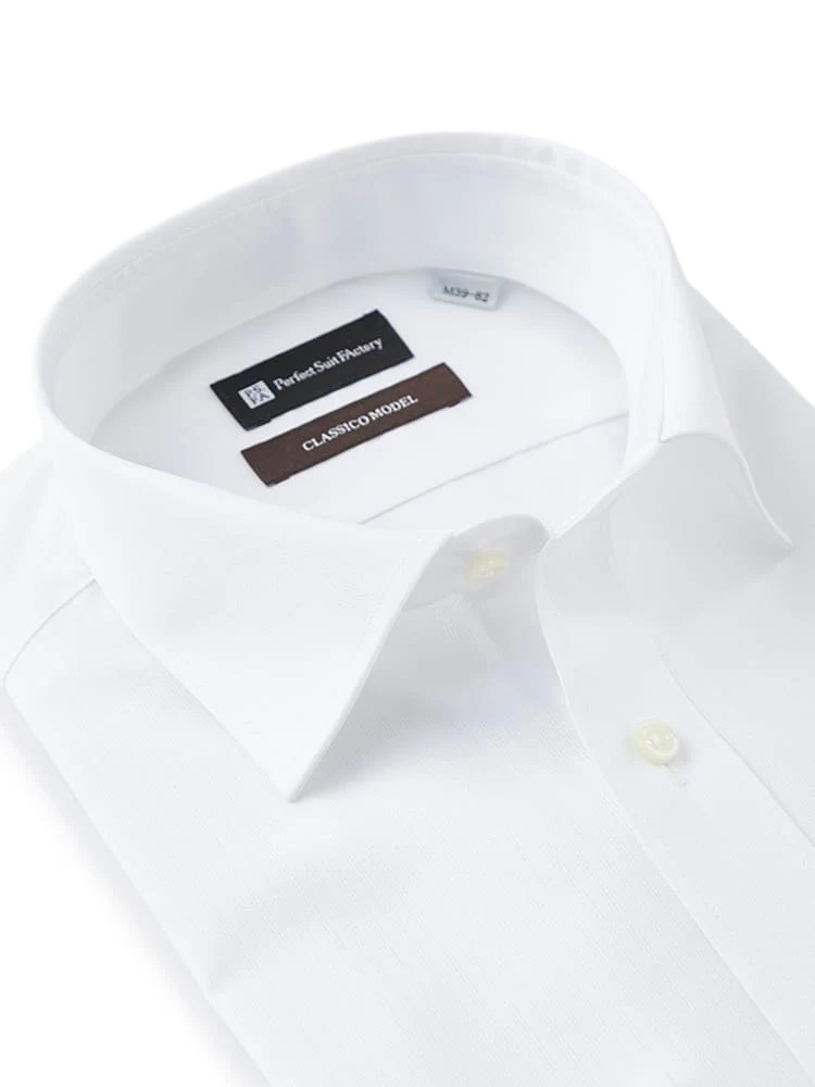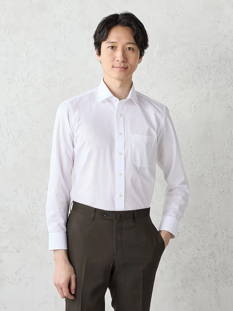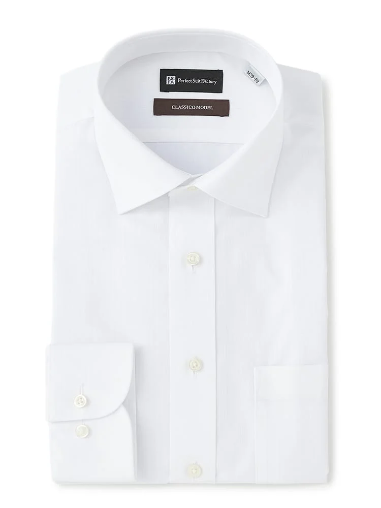 ベーシックなホワイトのセミワイドカラーシャツです。