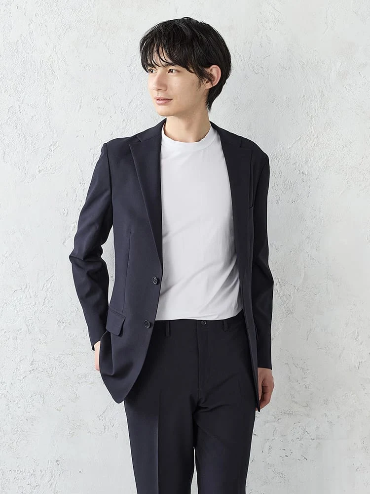 ジャケットは背抜きの裏地で動きやすく、スラックスはすっきりとしたノータックでビジネスシーンにぴったり。