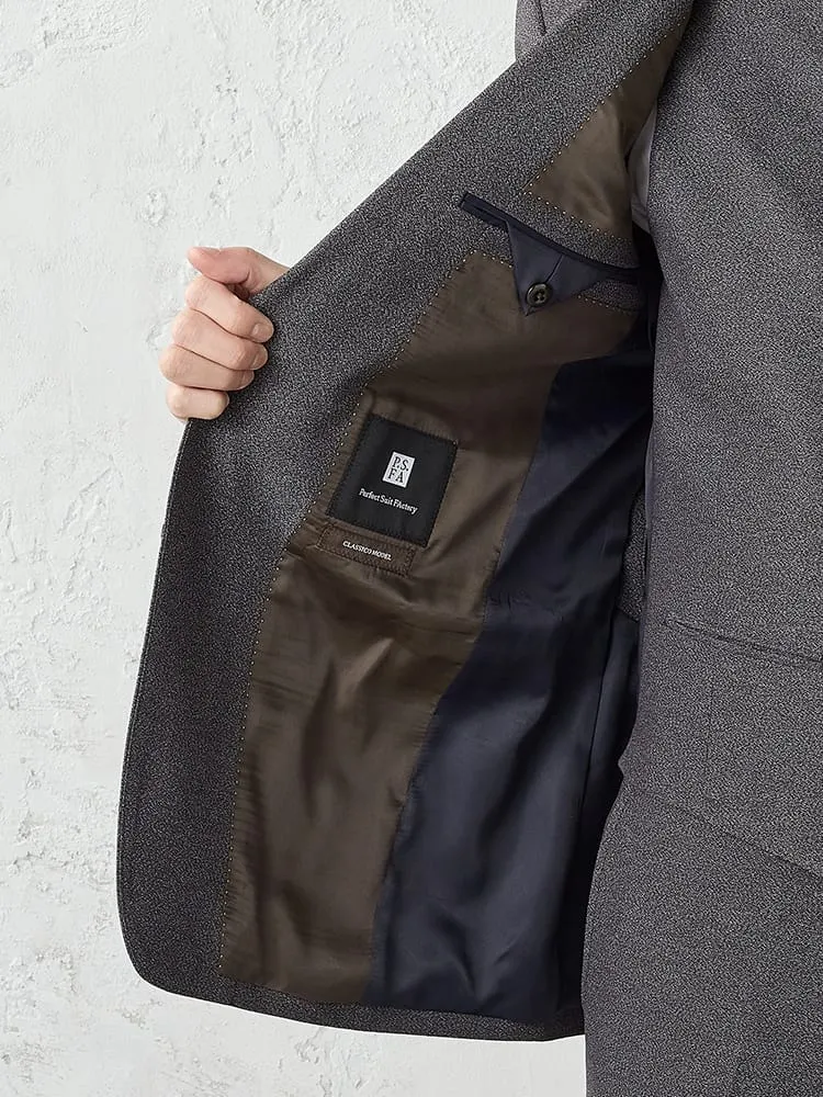 メランジ調のブラウン形カラーで、上品な佇まいに仕上げたセットアップ。