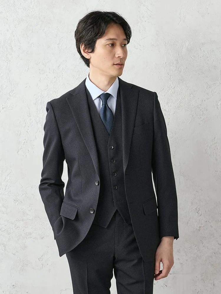 《WOOLYWASHSUIT》WEB限定スーツ【洗える/ウールライク】スリーピース千鳥×ウィンドペンブラック