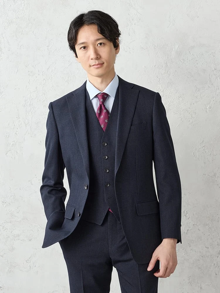 【上下洗える/ベスト付】スリーピーススーツ【クラシコ】グレンチェックネイビー