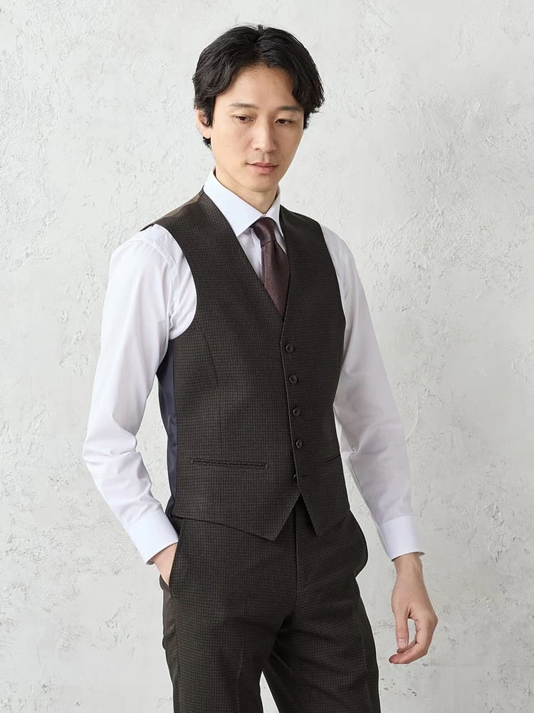 フォーマルな装いにも映える3ピーススタイルで、様々なコーディネートをお楽しみいただけます。