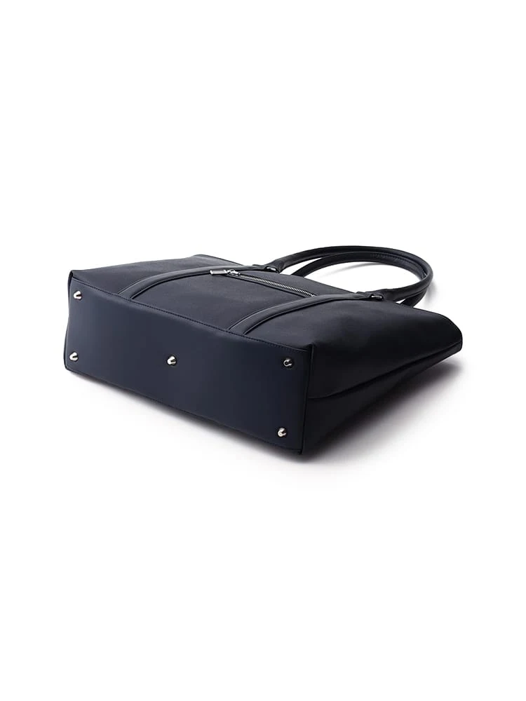 シボ入りのタフな素材感と底鋲付きにより、バッグが自立し、底部が汚れにくいのもポイントです。