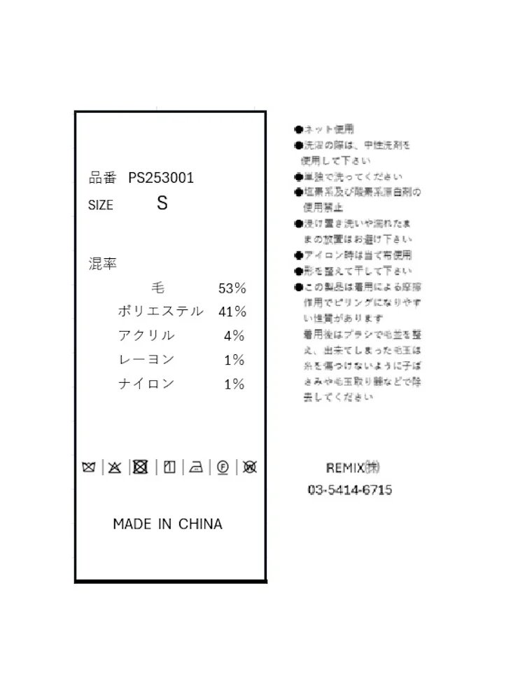 | 素材 | ウール53% ポリエステル41% アクリル4% レーヨン1% ナイロン1% |