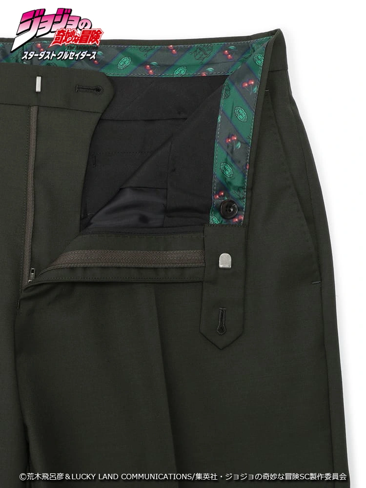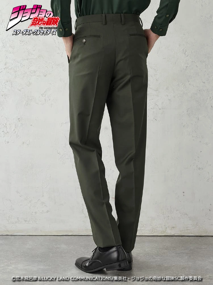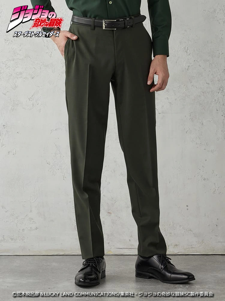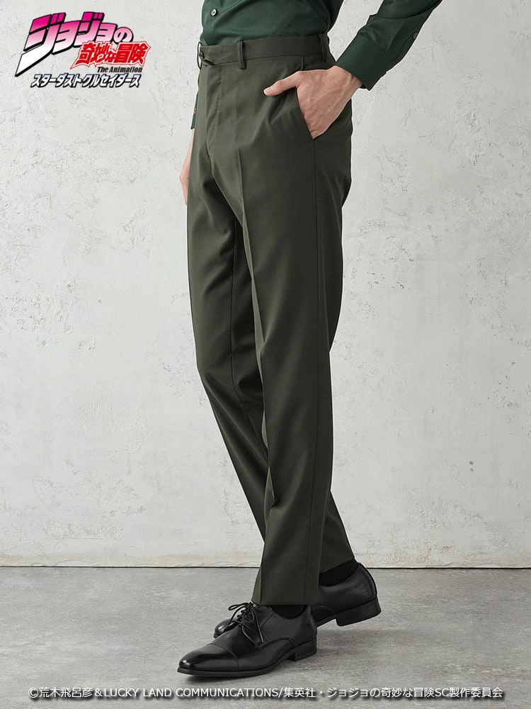 現代のサラリーマンに向けた新しいスーツをコンセプトに、メインキャラクターである【花京院典明/ ハイエロファントグリーン】をモチーフにしたパンツです。