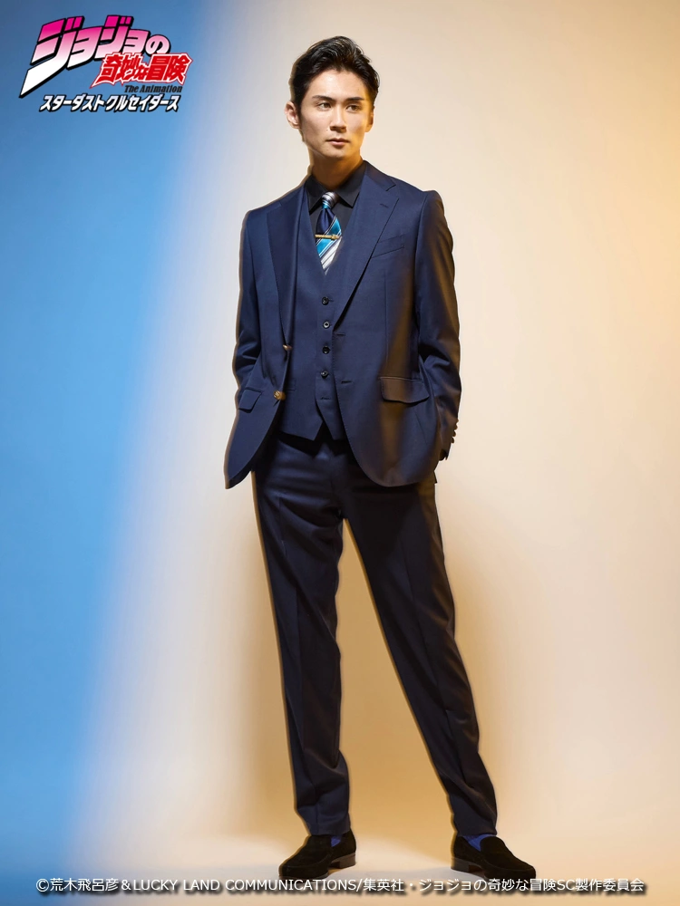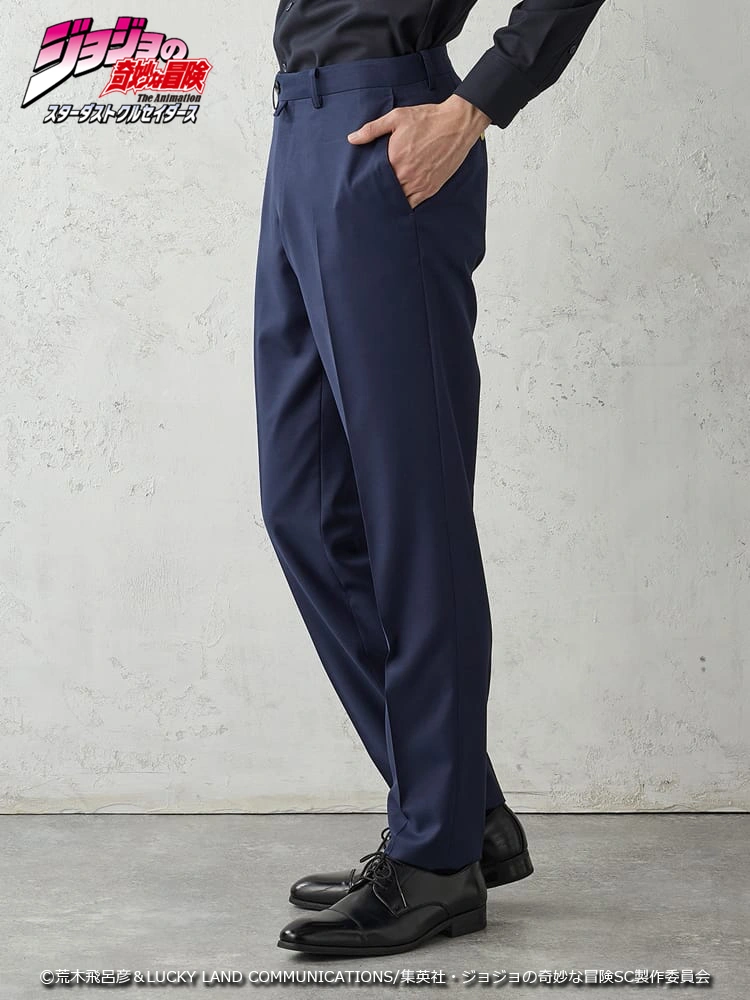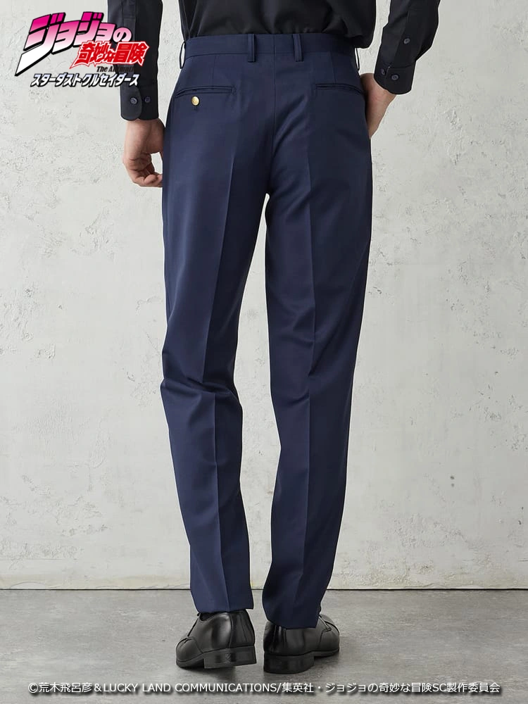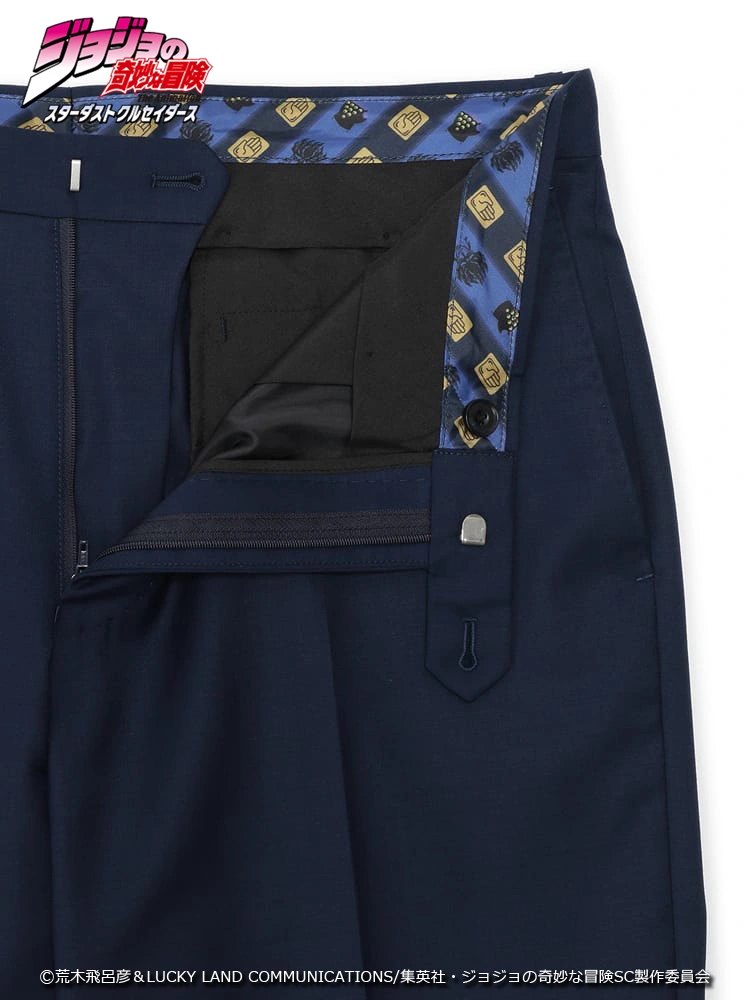 現代のサラリーマンに向けた新しいスーツをコンセプトに、メインキャラクターである【空条承太郎/ スタープラチナ】をモチーフにしたパンツです。