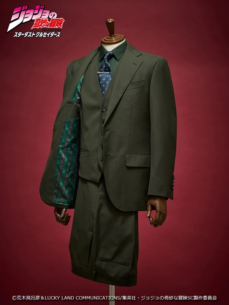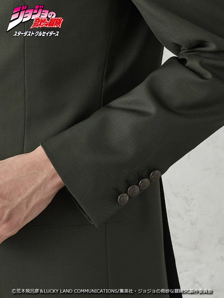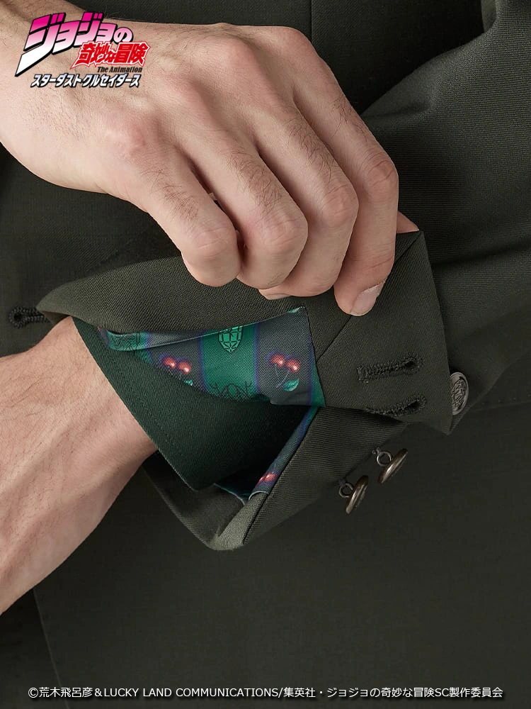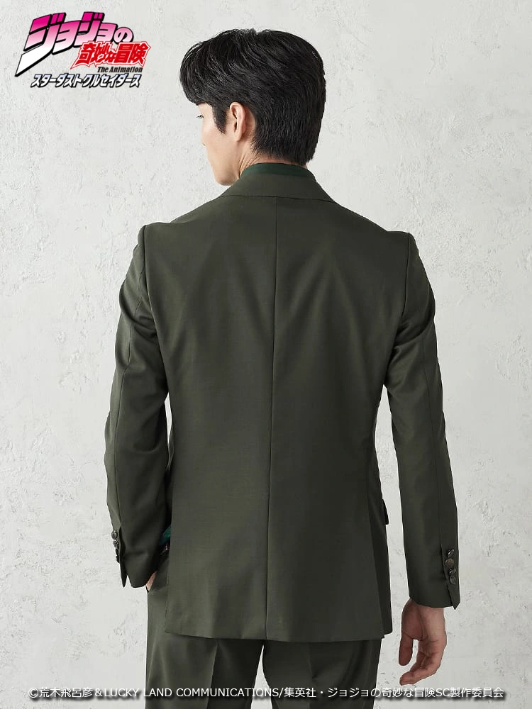 現代のサラリーマンに向けた新しいスーツをコンセプトに、メインキャラクターである【花京院典明/ハイエロファントグリーン】をモチーフにしたジャケットです。