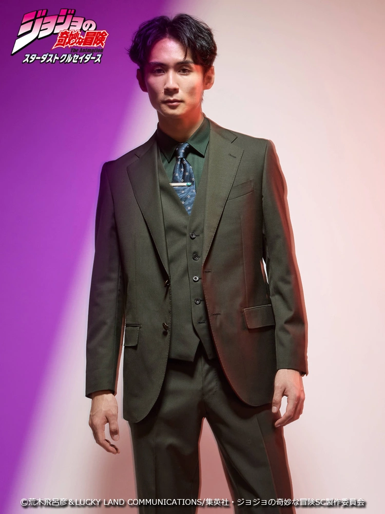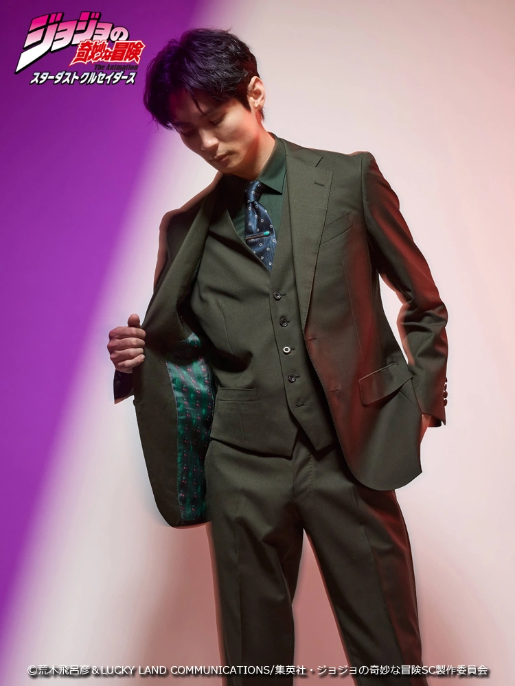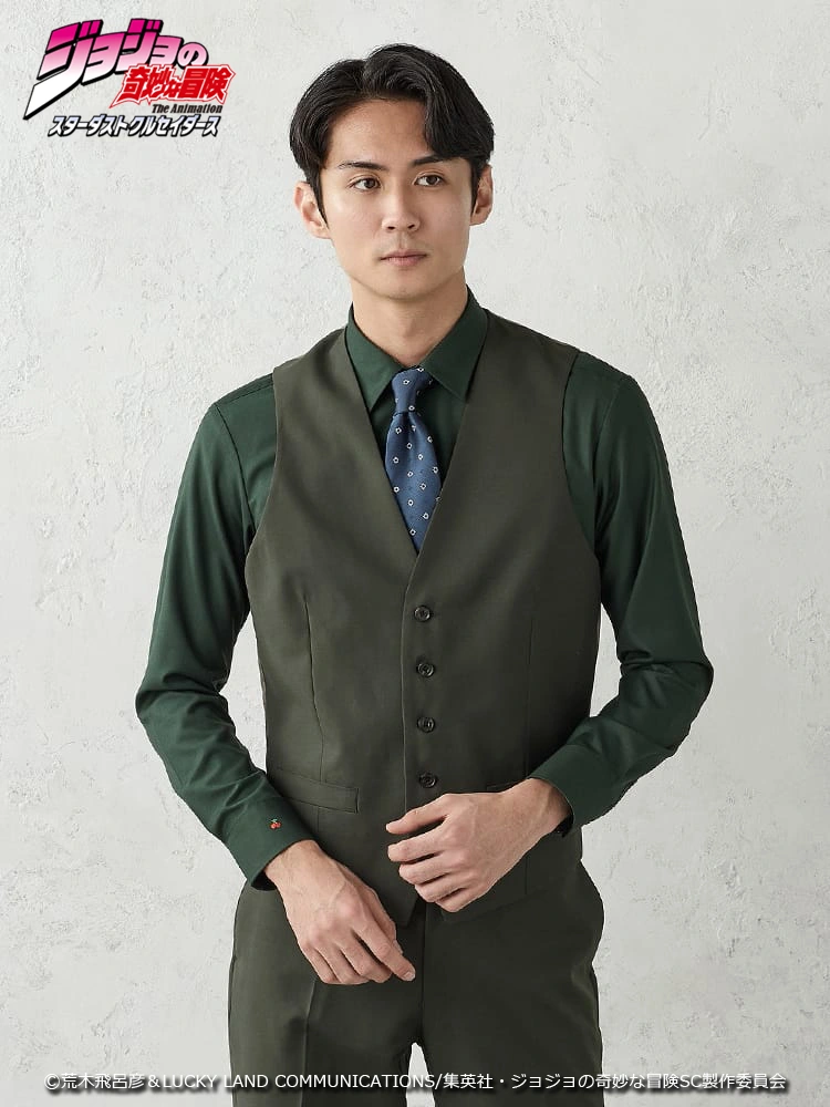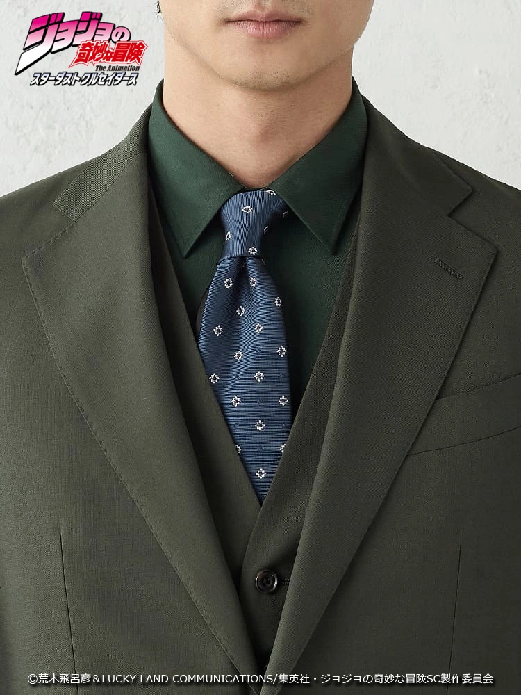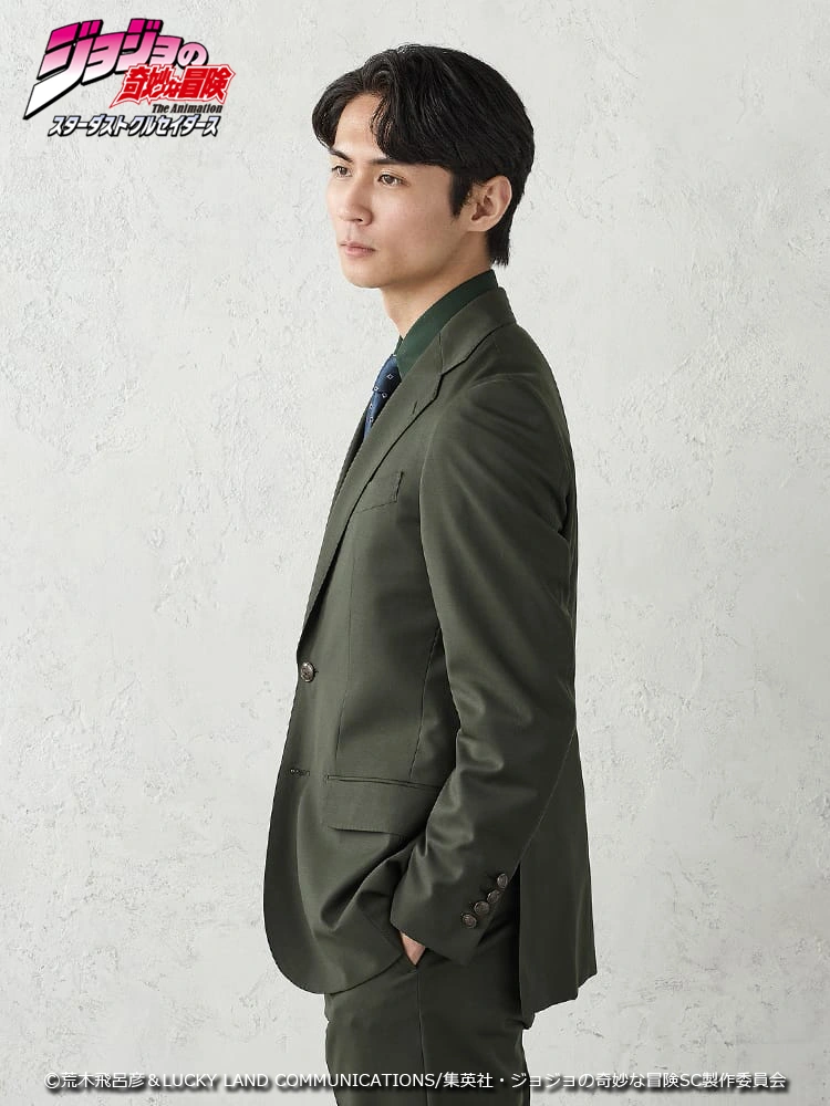 現代のサラリーマンに向けた新しいスーツをコンセプトに、メインキャラクターである【花京院典明/ハイエロファントグリーン】をモチーフにしたジャケットです。