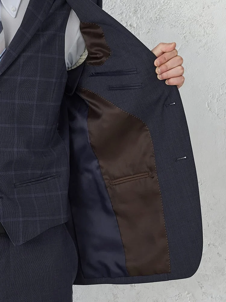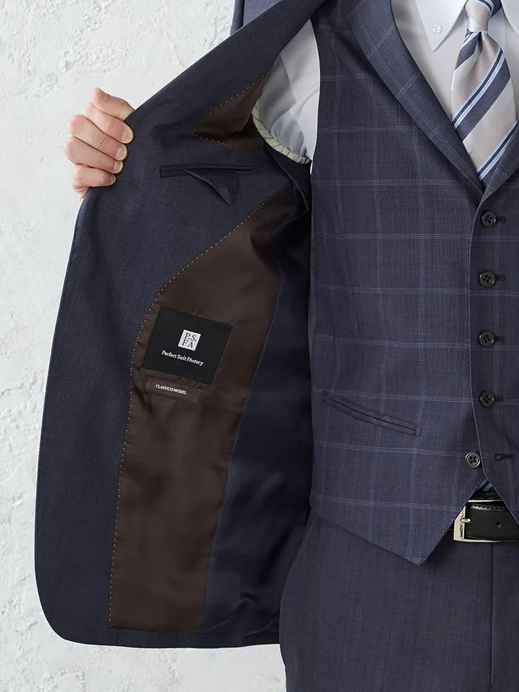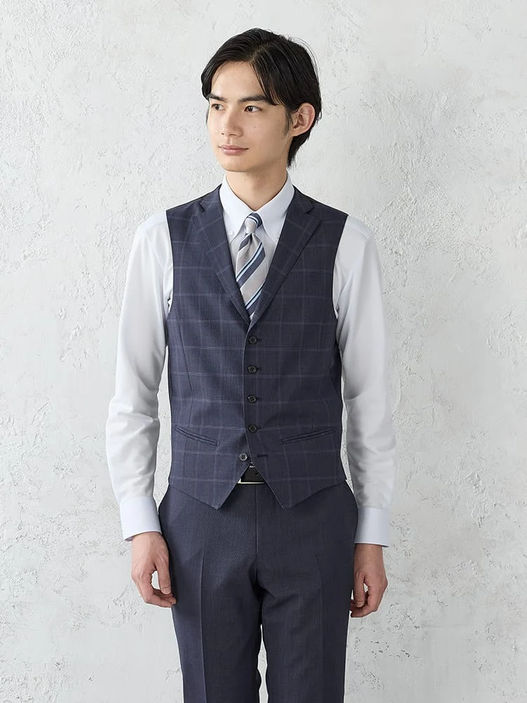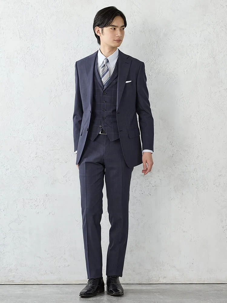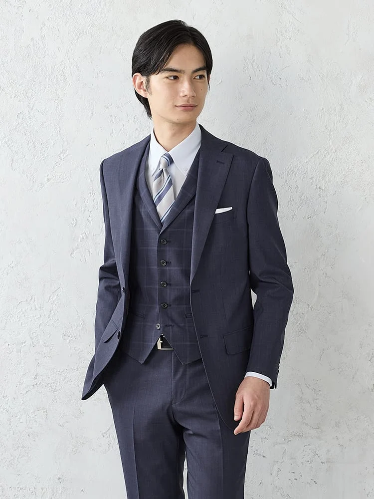同色チェック柄のベストを加えたスリーピーススーツ。