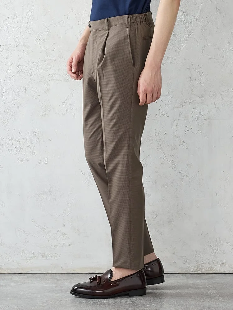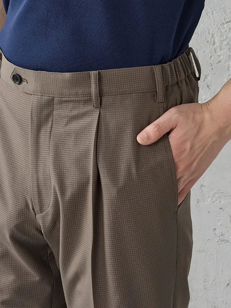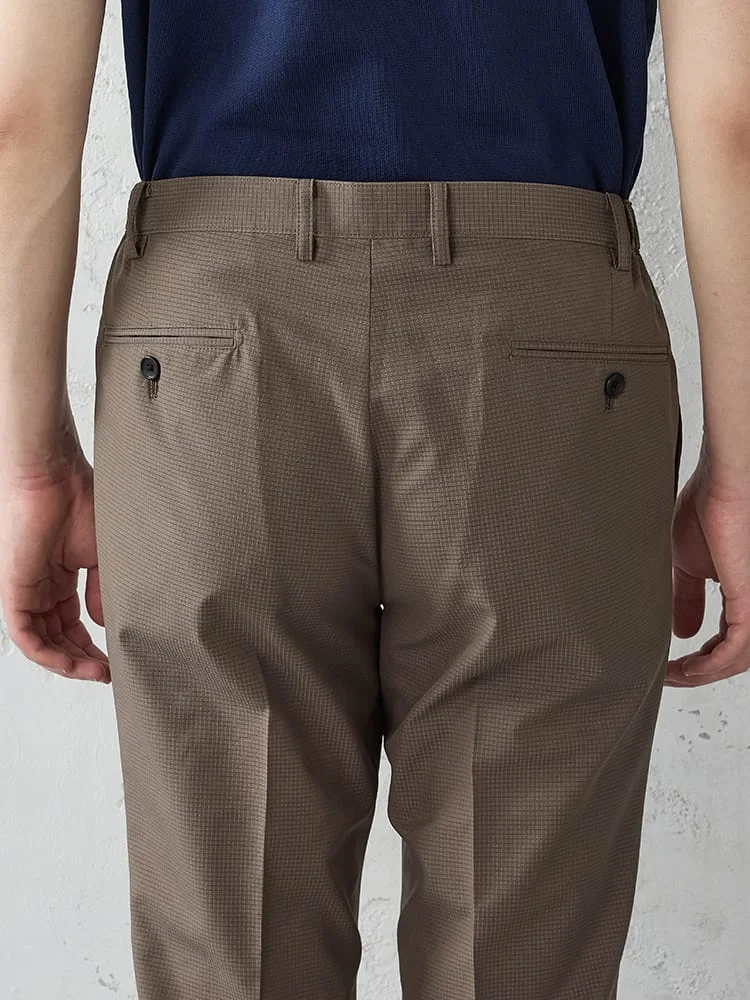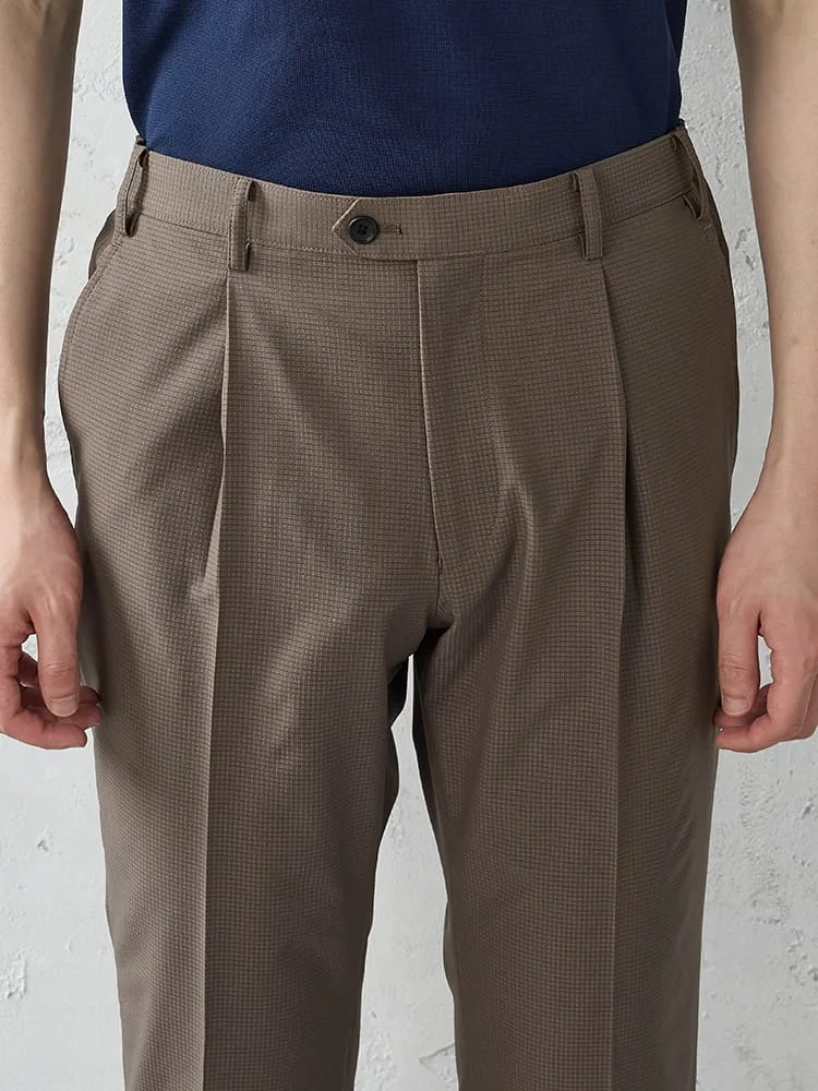 植物由来の糸を使用し、通気性・吸水速乾性・2WAYストレッチ性・撥水性・UVカットを兼ね備えた多機能ファブリックを採用したワンタックパンツ。