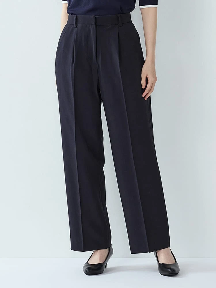 落ち感のある直線的なシルエットがレッグラインをカバーするパンツ。