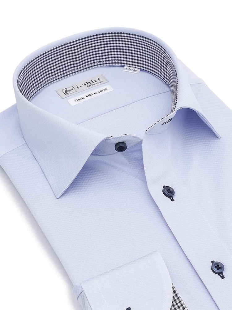 清潔感があるサックス×上品な存在感を発揮するマイクロロンビック柄のアイシャツ。