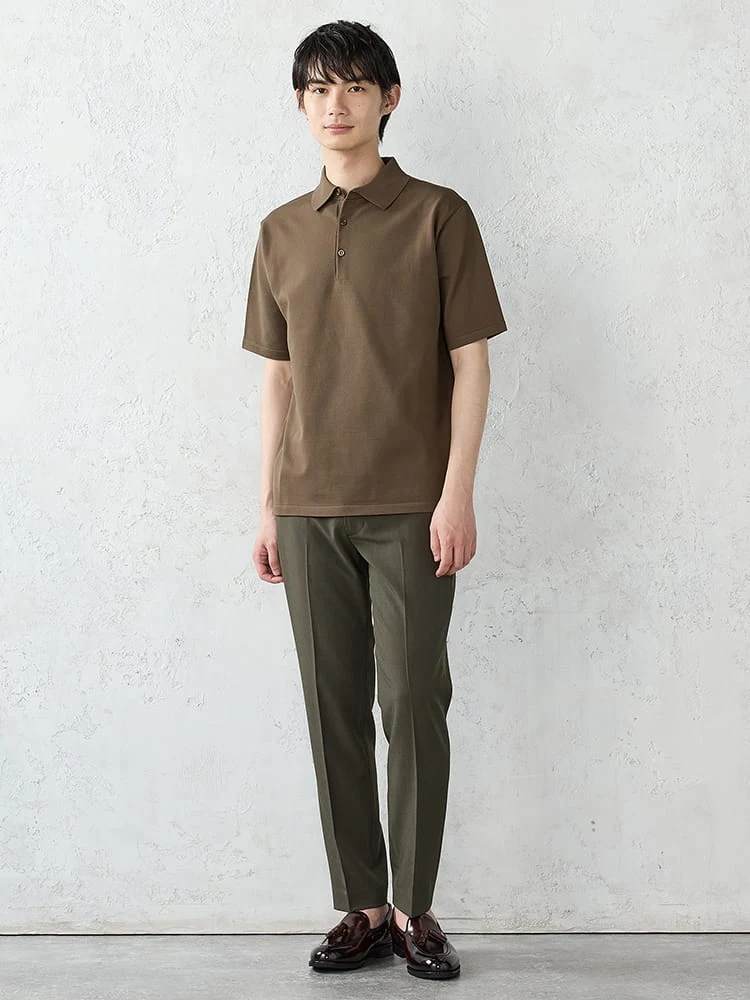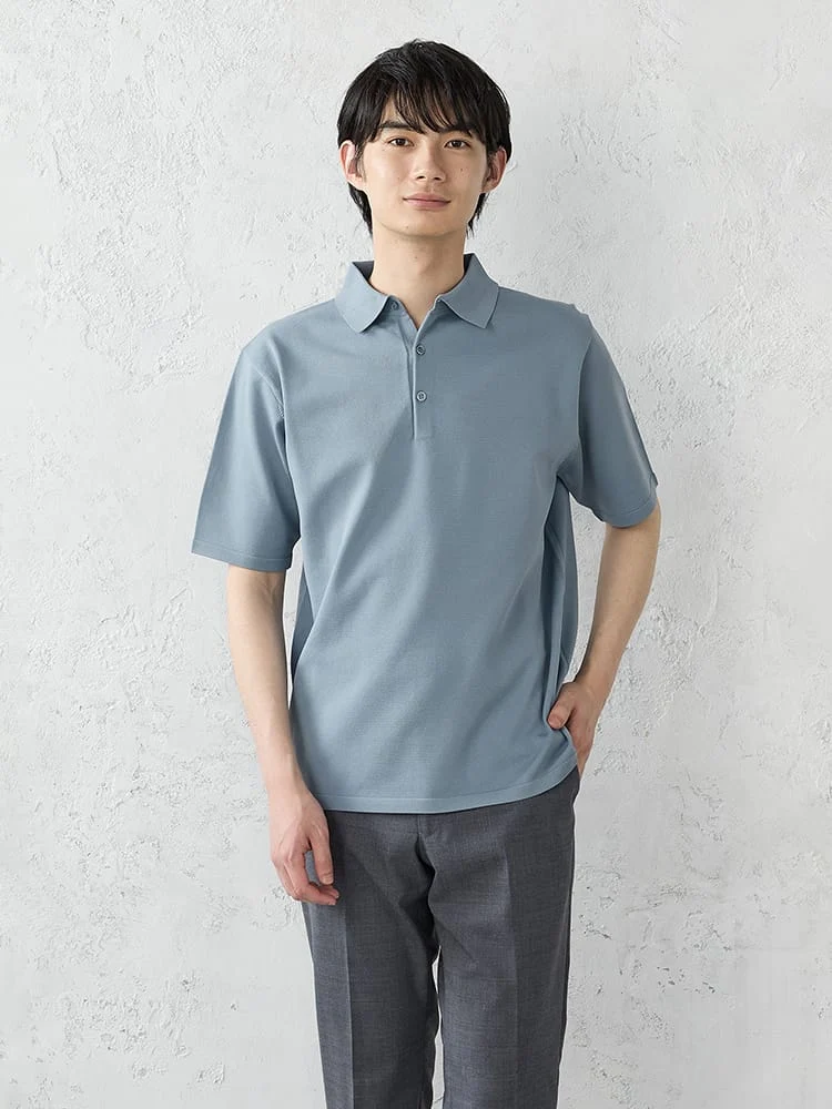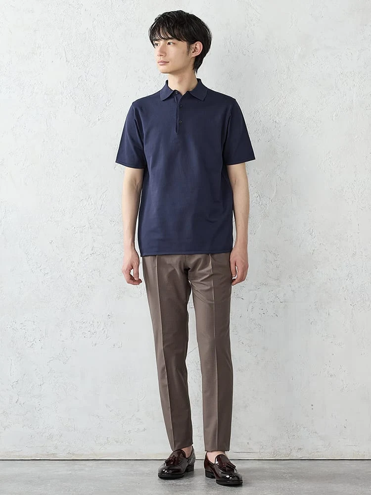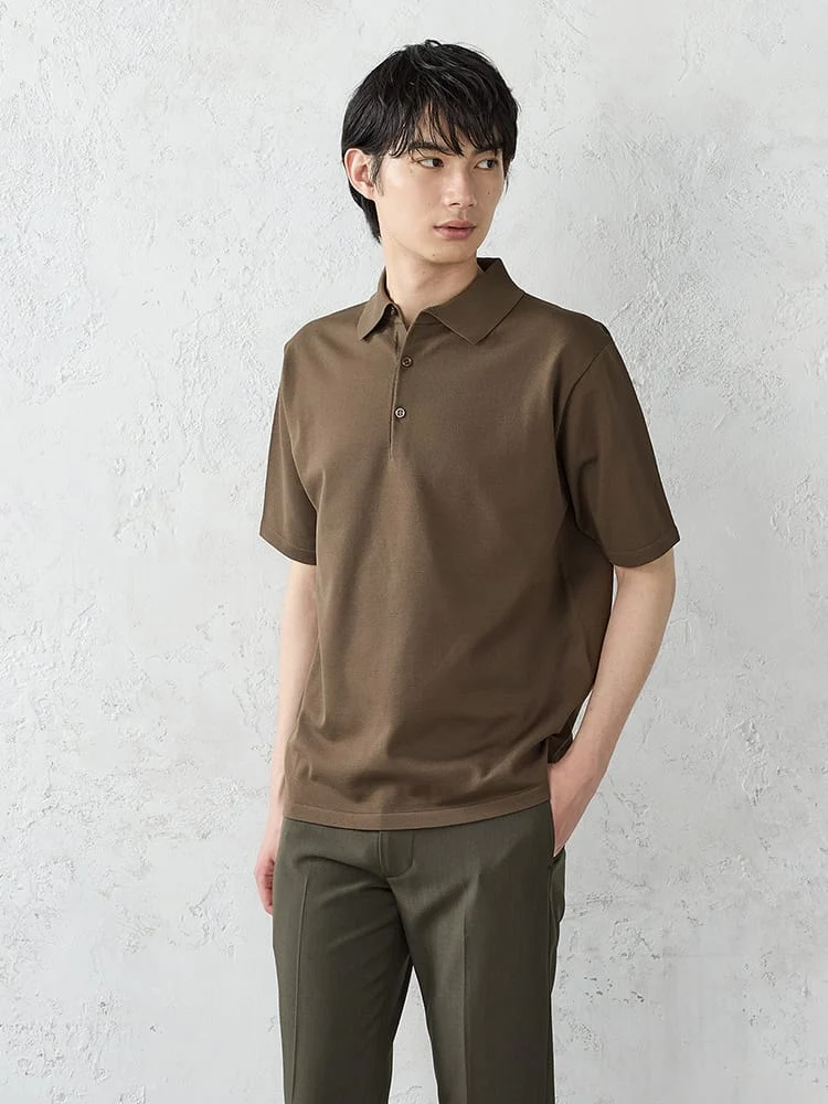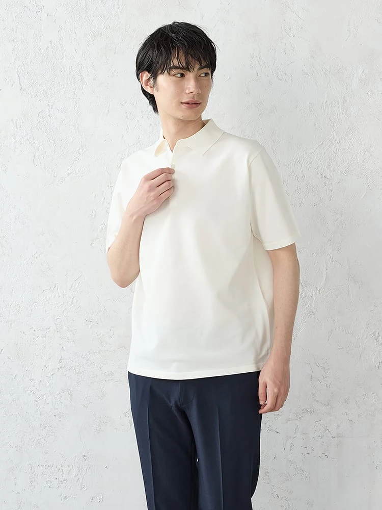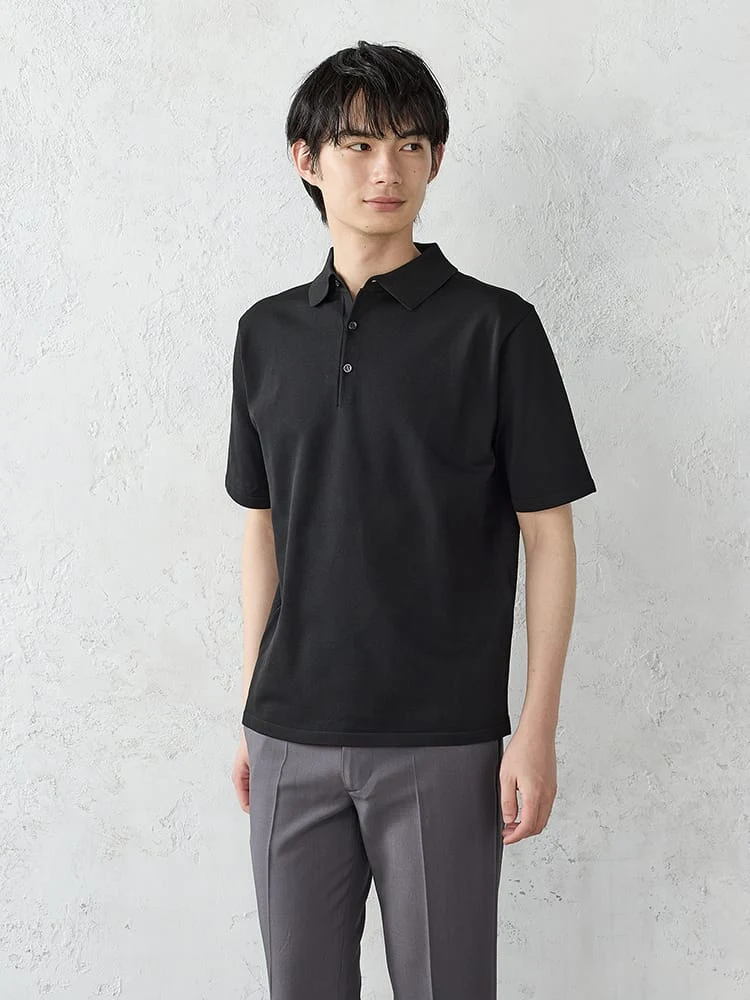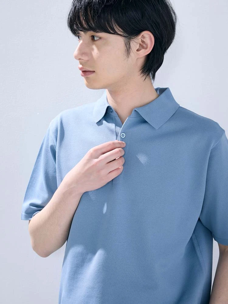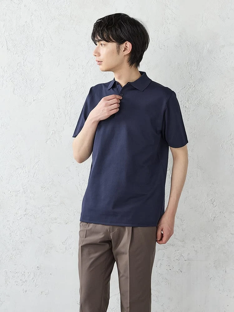 一枚着としてもジャケットインでも使い勝手が良い、ベーシックな単色デザインのニットポロシャツ。