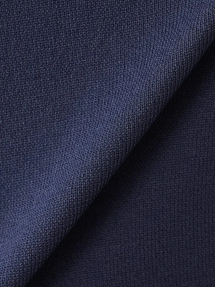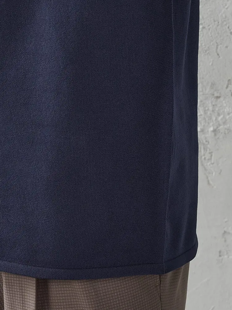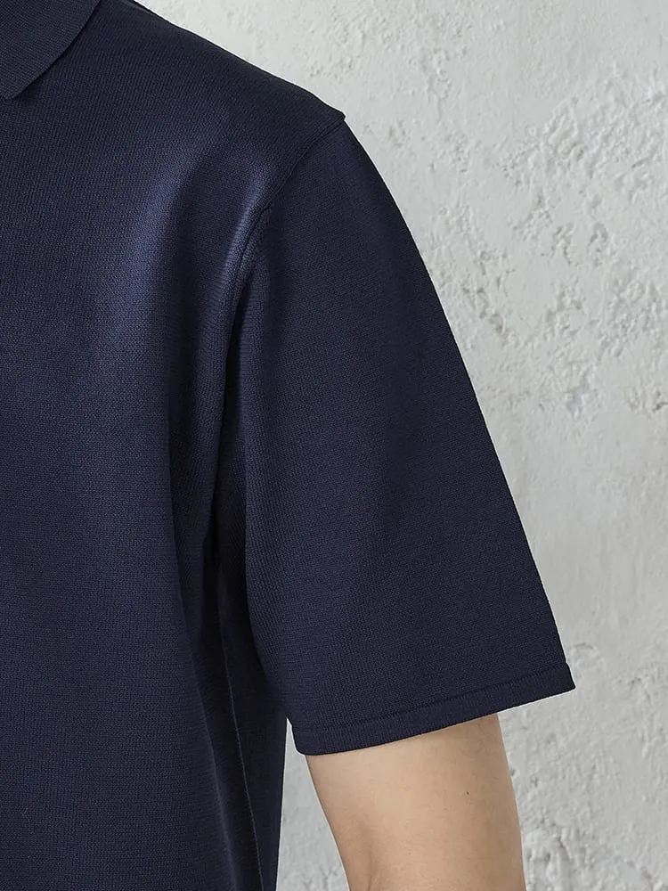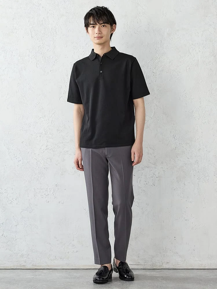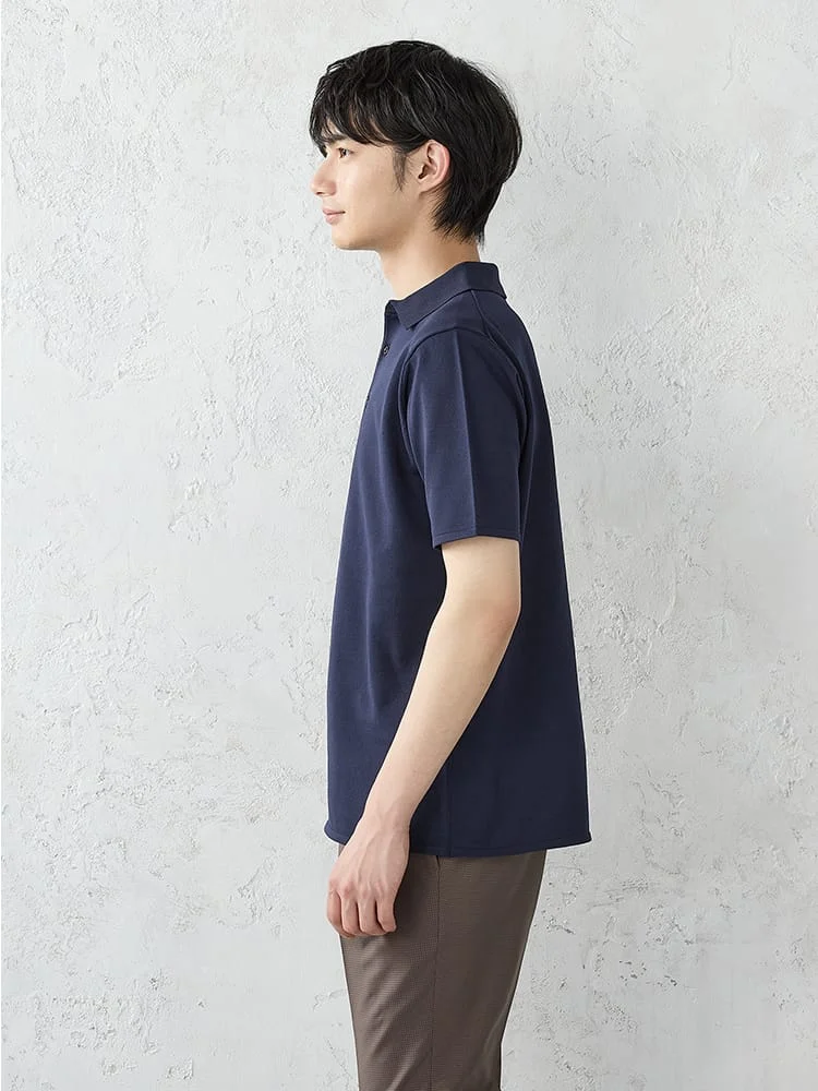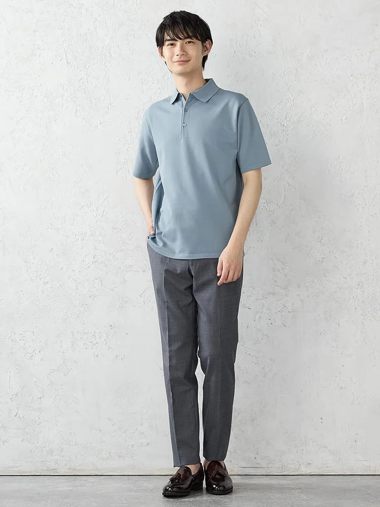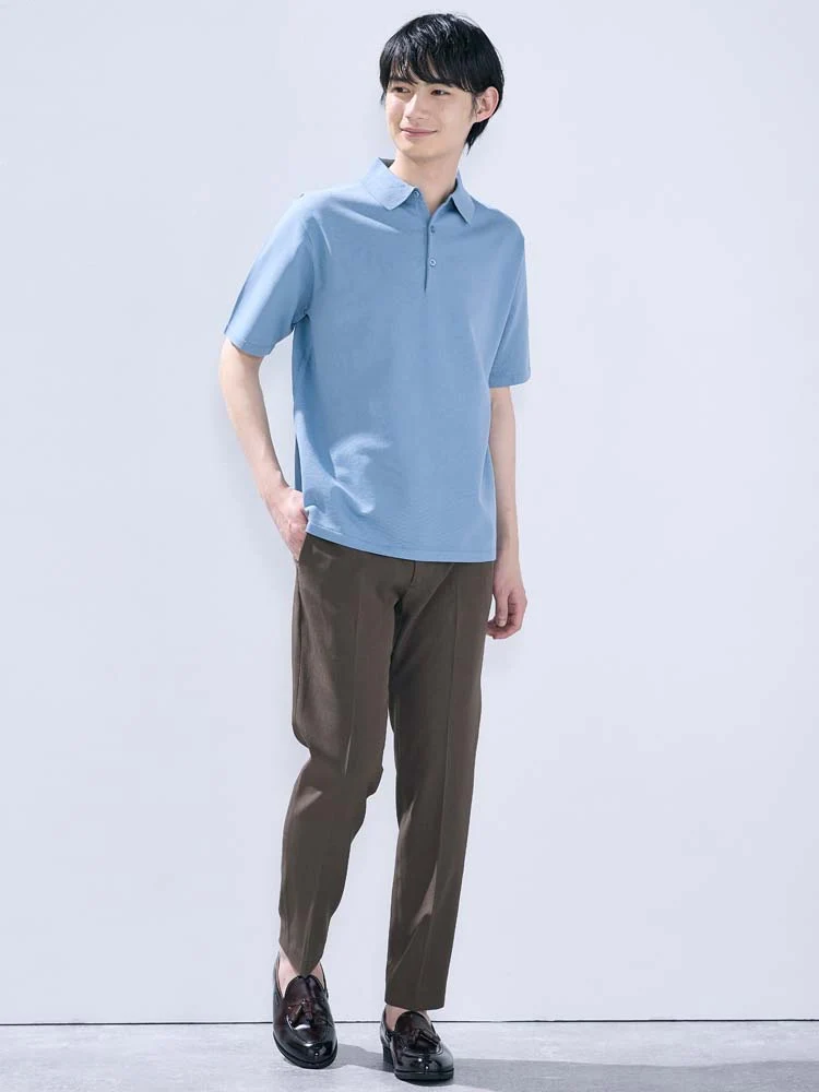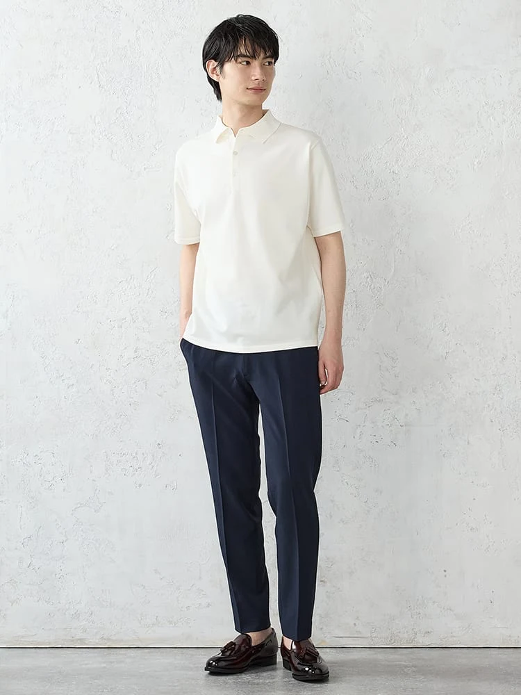 一枚着としてもジャケットインでも使い勝手が良い、ベーシックな単色デザインのニットポロシャツ。