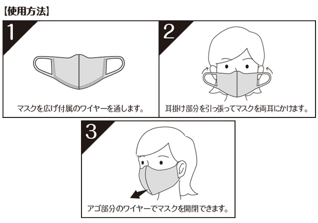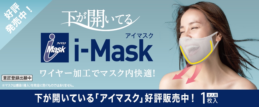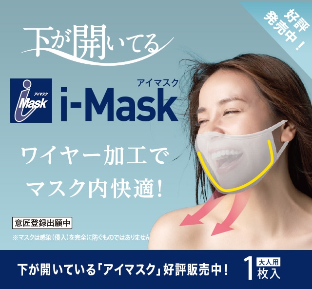 オンラインショップ限定で販売させていただいた『下が開いてるi-Mask(アイマスク)』が、好評により即日完売となりましたが、オンラインショップで再販売をさせて頂くことになりました。マスク内の不快なムレや暑さに着目し、アゴ部分にワイヤーを取り付けることで空気の通り道を作りマスク内のムレを軽減し快適に着用可能な『下が開いてる i-Mask(アイマスク)』を開発しました。